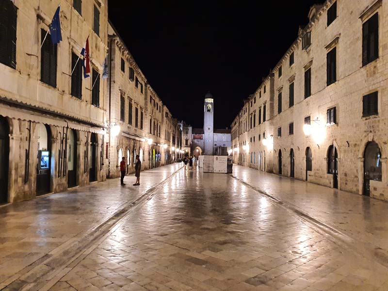 Nakon što smo se smjestili u apartman, odlazimo na Stradun. Ulazimo na Stradun i zateknemo nešto što je gotovo nemoguće vidjeti u ovo doba godine, Stradun je prazan! Pogledamo na terase kafića i restorana, i one su poluprazne. Jako žalosno i neočekivano, ali to su sve posljedice korona virusa koji nas je zahvatio. Odlazimo do restorana i doživljavamo još jedan šok, ali ovaj puta pozitivan, Dubrovčani su prilagodili cijene novonastaloj situaciji tako da smo na samom Stradunu jeli hobotnicu za 88 kn i tuna steak za 90 kn. To nas je toliko iznenadilo da smo tada odlučili ostati još jedan dan u Dubrovniku, jer, kada ćemo opet imati priliku tako povoljno boraviti ovdje. Nazvali smo vlasnika apartmana i rezervirali apartman za još jednu noć (drugu noć smo platili 400 kn). Nakon večere i šetnje starim gradom, vraćamo se u apartman gdje završava naš treći dan putovanja.