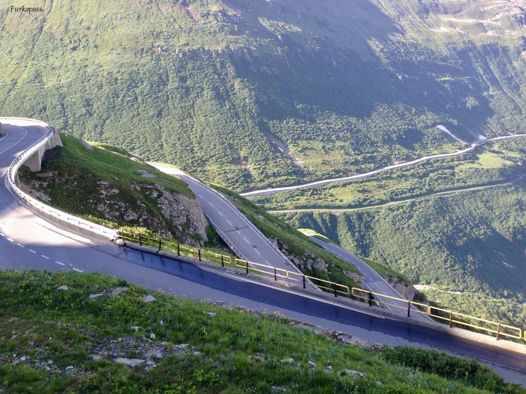 Ajmo na Furkapass! Kreće kao vijugava cesta i odjednom počinju serpentine maskirane u zelenilu, nakon kojih se cesta počinje penjati s većim razmacima do sljedeće serpentine. Na par mjesta pri izlasku iz zavoja izgleda kao da vozim u nebo. Na ovoj dionici je sniman James Bond “Goldfinger” , a kad nema prometa doista izgleda kao da se vozite u nekom filmu.