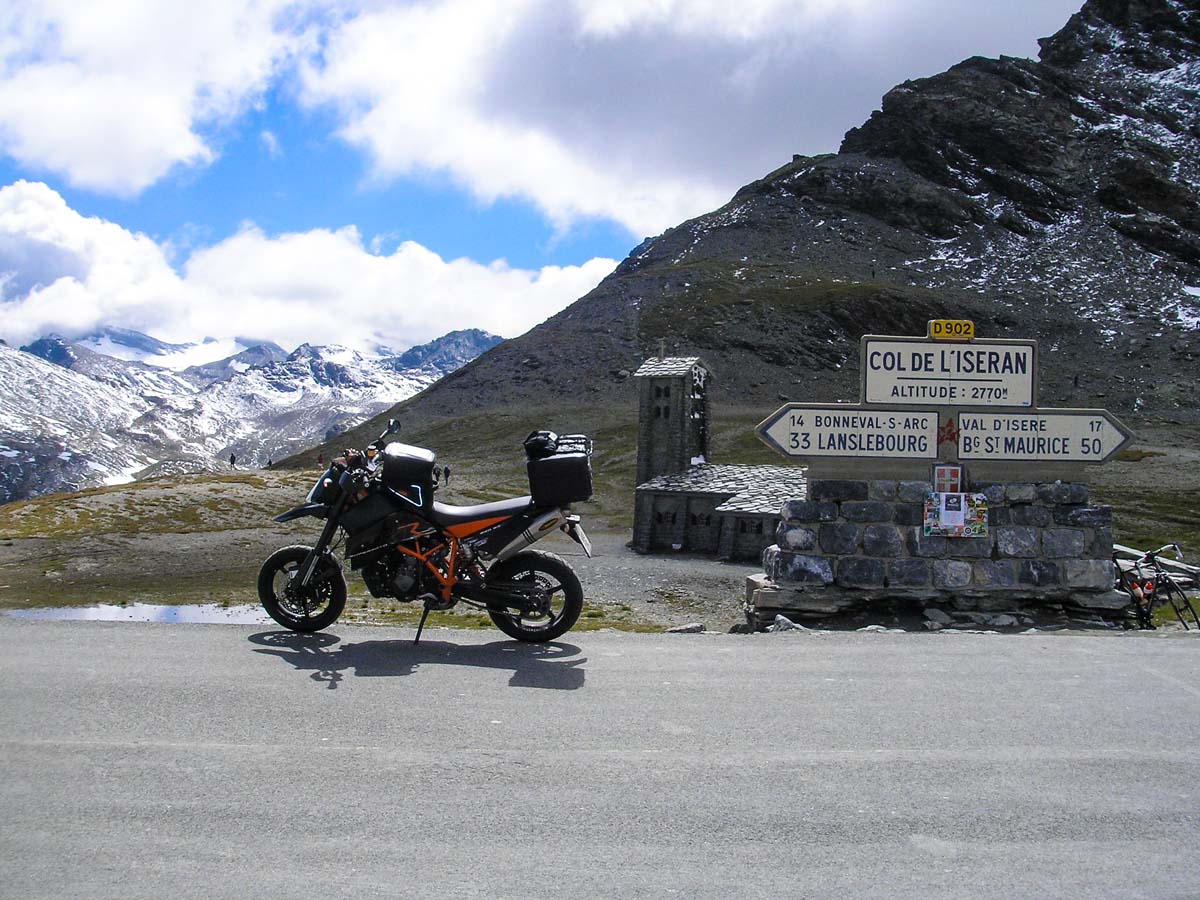 Spuštanje s ovoga prijevoja vodi u Bourg St. Maurice, gdje skrećemo lijevo prema Val d’Isereu predivnom cestom. Bez obzira na „šarmantne“ zakrpe, asfalt odlično drži i uz lagano poskakivanje iz zavoja u zavoj kroz par tunela stižemo u Val d’Isere. Bez obzira što je poznat kao skijalište, među motociklistima je poznat i po Col de l’Iseranu, obližnjem prijevoju kojeg bi po spektakularnosti svrstao uz Stelvio.