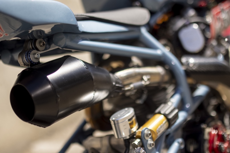 Usis je preko para rasplinjača Keihin FCR 39, a Wolfman 2-u-1 usmjerava vrući ispuh iz motora od 900 ccm. Snaga se dovodi preko Ducabike spojke, a motocikl ima quickshifter — trik!
