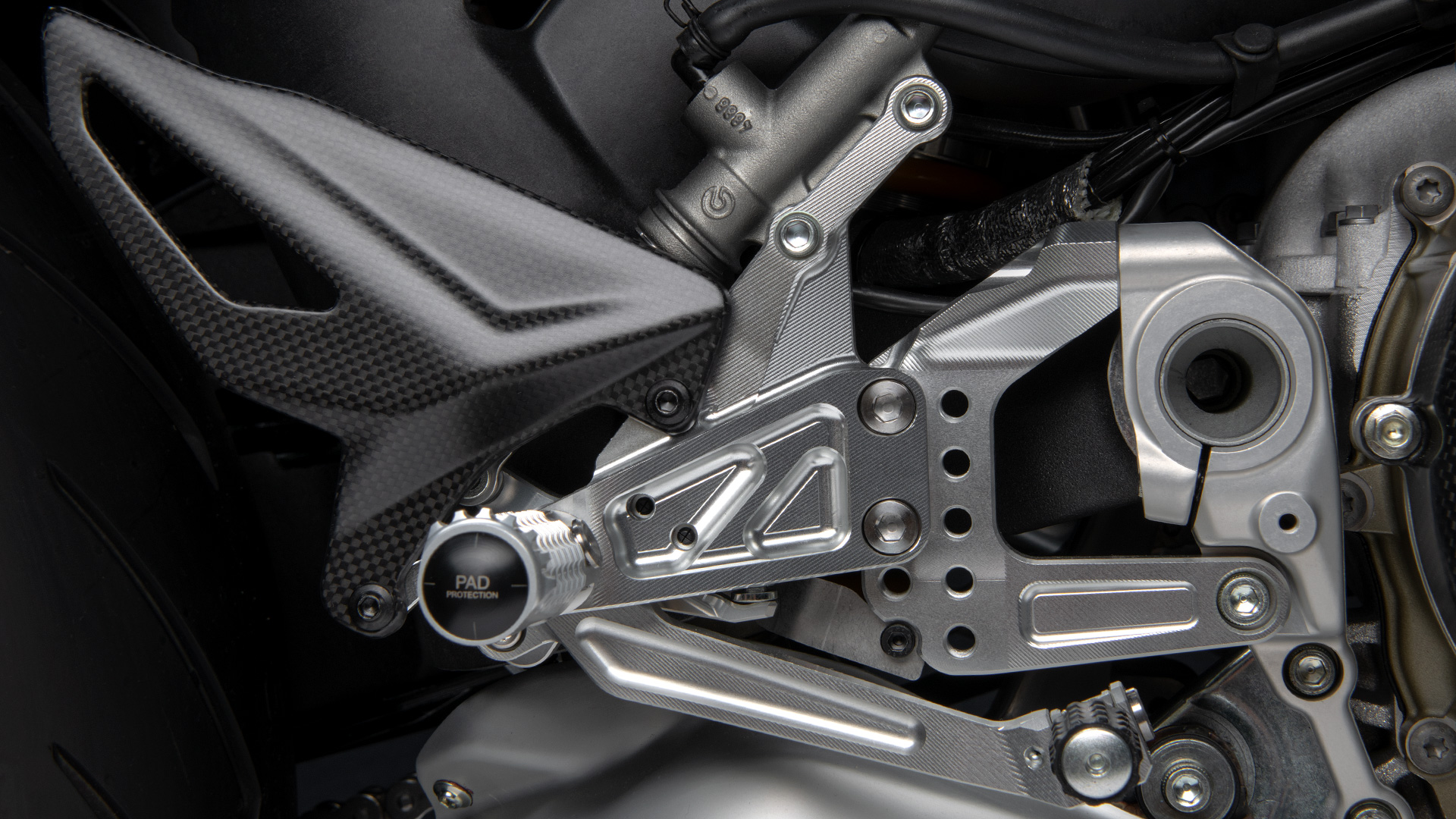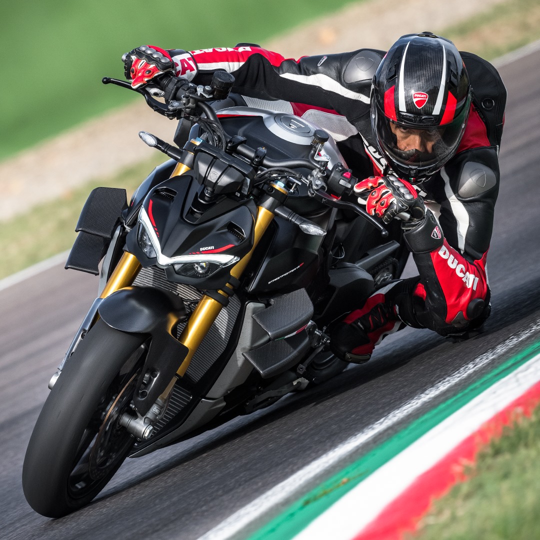 Novi karbonski naplatci, 1,4 kg lakši od onih na Streetfighteru V4 S, značajno smanjuju moment inercije i doprinose ukupnoj uštedi težine od 3 kg. Motor Desmosedici Stradale obujma 1103 ccm ima proturotirajuću radilicu, “Twin Pulse” redoslijed paljenja, 208 KS snage i 123 Nm okretnog momenta pri 9500 o/min. b osigurava učinkovitiju funkciju protiv skakanja, ali također reproducira karakterističan zvuk koji Ducatisti toliko cijene. Sveobuhvatan asortiman opreme upotpunjen je ovjesom Ohlins Smart EC 2.0 i kočionim sustavom Brembo Stylema R® s prednjim čeljustima.