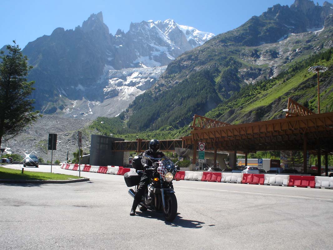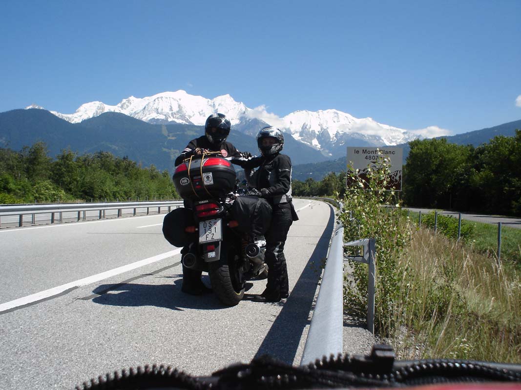Put nas vodi ka Maconu na čijoj ćemo se periferiji odvojiti lijevo prema Genevi. Na jednoj benzinskoj pumpi susrećemo 10-tak Francuskih policajaca koji voza Yamahe FJR. One su službena vozila Francuske policije. Motocikli su potpuno novi i vjerojatno su ih vozili u neki veći grad. Pošlepali smo se iza njih jer nisu vozili ispod 180, tako smo dobar dio puta prevalili u teškom prekršaju ali pod pratnjom zakona. Može li ljepše. Kod Geneve plaćamo prvu cestarinu 27 €. Put nas dalje vodi ka Chamonixu i tunelu Mont Blanc.