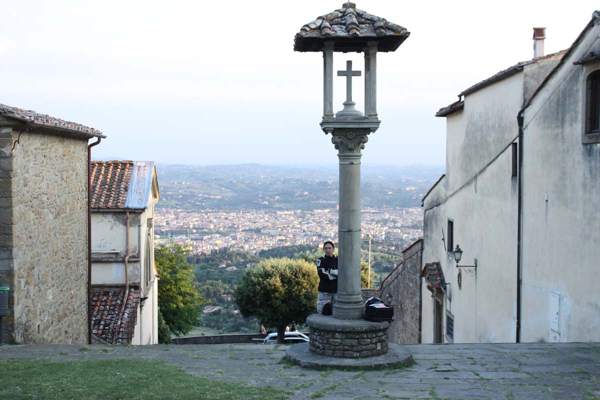 Nedaleko Duoma u jednoj tratoriji naručujemo bruschete, tj. nekoliko malih sendviča na kriškama francuskog kruha koje su prekrivene raznim namazima i povrćem, a servirani su na drvenom podlošku. Za taj „obilni obrok“ konobar nam otima 25 Eu. Polu siti vozimo se do 10 km udaljenog Fiesolea na zapadnom ulasku u Firencu. Ovdje s na vrhu brežuljka smjestio malen gradić van gradske vreve. U parku pod sjenom crnogirca mnoštvo slikara odavde temperama i vodenim bojama slika poznati pogled na Firencu.