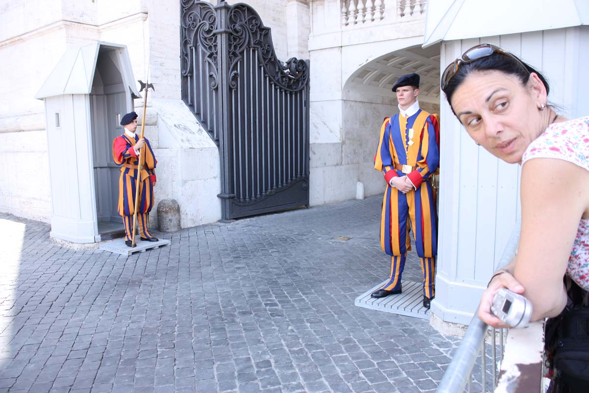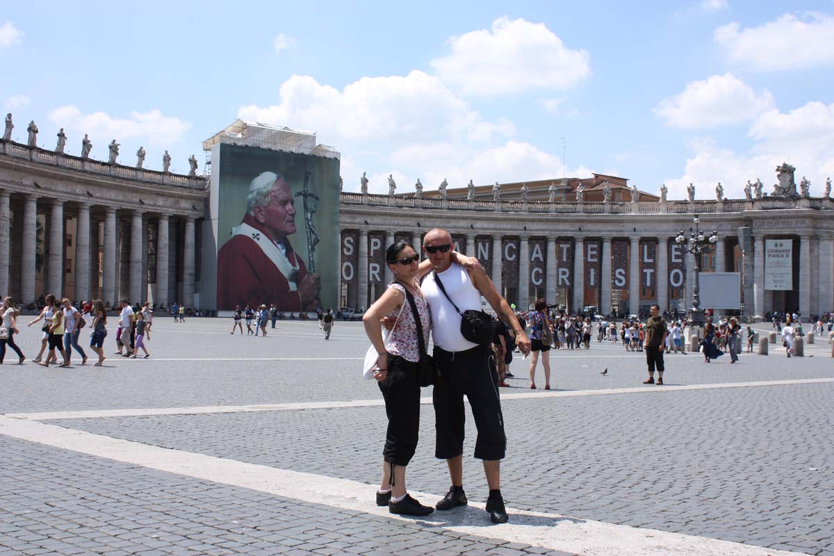 Odlazimo na spavanje jer ujutro nas čeka Vatikan. Nakon jutarnje kave upisujemo u Garmina ime Vatikana i on nas dovodi tik do trga Sv. Petra. Nemoguće je pronaći parkirno mjesto ili dio pločnika na kojem bi parkirali motor. Pomičemo jedan kontejner za smeće na nečiji kolni ulaz i pravimo mjesta za našu Yamahu. Zaključavamo je aktiviramo alarm i odlazimo u najmanji grad državu na svijetu Vatikan. U pošti molimo da nam udare žig u putovnice za uspomenu no ležerno nas odbijaju. Dolazimo do ogromnog trga Sv. Petra na čijoj sredini dominira visoki obelisk. Berninijeve ovalne kolonade pretvaraju prilaz bazilici Sv. Petra u ruke koje u zagrljaj zovu vjernike i nude im dobrodošlicu. Trg krasi i velika slika Ivana Pavla II koja će vjerovatno još dugi niz godina stajati kao podsjetnik na ovog izuzetnog čovjeka i Papu kojeg su voljeli mnogi diljem svijeta.