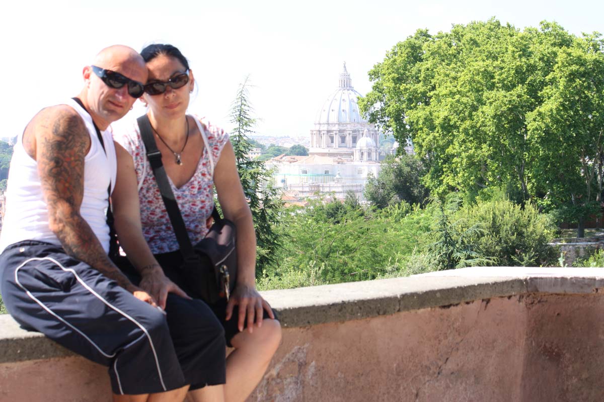 Dugo čekamo u redu za ulazak u Baziliku. Tek što smo se domogli ulaza mene unutra ne puštaju zaštitari zbog prekratkih rukava na majici. Morat ću se zadovoljiti šetnjom van sakralnih objekata unutar Vatikana. Razočaran ali ne i nesretan fotografiram ono što mi je dostupno a toga je doista mnogo. Vruće je 38 C, gomila se tiska u redu za ulazak u crkvu a ja gledam naše sljedeće odredište na karti vječnog grada. Odlazimo brdskom cestom do Gianicola na vrh hrpta koji Vatikan odvaja od Trasteverea i odakle se pružaju najljepši pogledi na grad. Ovdje je također prekrasan park u kojem se održavaju lutkarske predstave. Trgom dominira konjanički spomenik Garibaldiju i njegovoj supruzi Aniti koja je ovdje sahranjena.