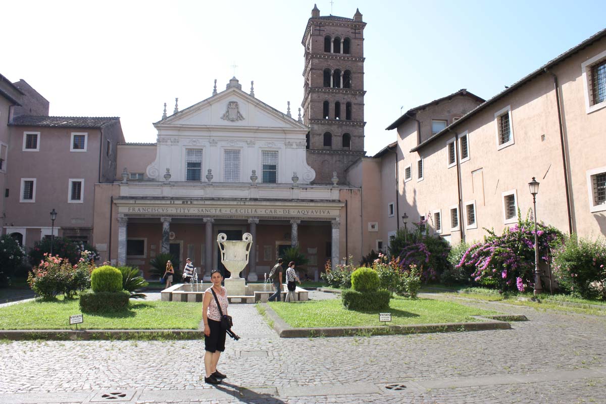 Dugo uživamo na pogledu na grad, a ja se još i iživljavam na svom Canonu. Transtevere u doslovnom prijevodu znači: preko Tibera. Idemo ga onda dobro istražiti. Spuštajući se s Gianicola stižemo u sami centar Transteverea do crkve Santa Maria. Ovo je najstarija Rimska crkva sagrađena 337 godine u čast djevici Mariji. Trg i crkva vrlo su dojmljivi iako i ovdje na pločniku leže beskućnici. Desetak minuta hoda od ove crkve nalazi se još jedna važna sakralna građevina. Crkva Santa Cecilia in Transtevere. Sagrađena je iznad svetičine kuće. Cecilia je bila Rimska patricijka koja je potajno bila kršćanka. 230 godine politički protivnici držali su je tri dana zatvorenu u parnoj kupelji iz koje je ona izašla pjevajući (tako je postala zaštitnicom glazbe).