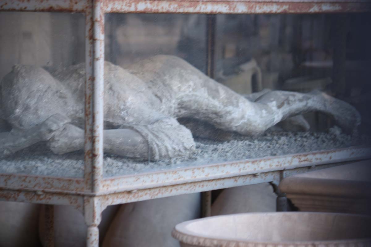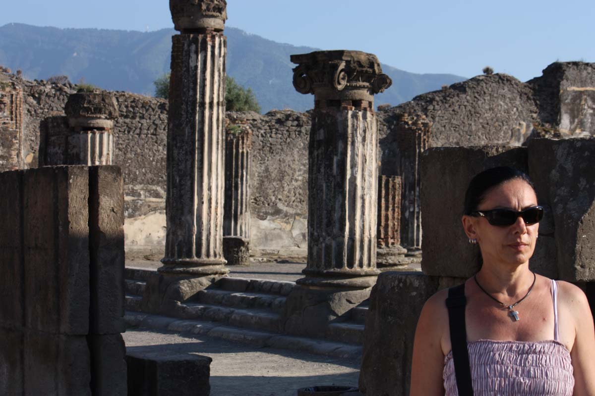 Nakon dugog hodanja po ruševinama stigli smo do glavnog trga. Očekivali smo da ćemo uz put vidjeti okamenjene ljude i životinje u trenu kada ih je zatekla nesreća erupcije vulkana. Svi oni su međutim premješteni u nekakvo improvizirano skladište i poslagani na police kao figure zajedno sa iskopanim predmetima iz svakodnevnog života onog doba. Povremeno bacim pogled na 20-tak km udaljeni Vezuv i izgleda mi nemoguće da je uspio takom brzinom i tako daleko dobaciti sadržaj svoje utrobe do ovih nesretnika.