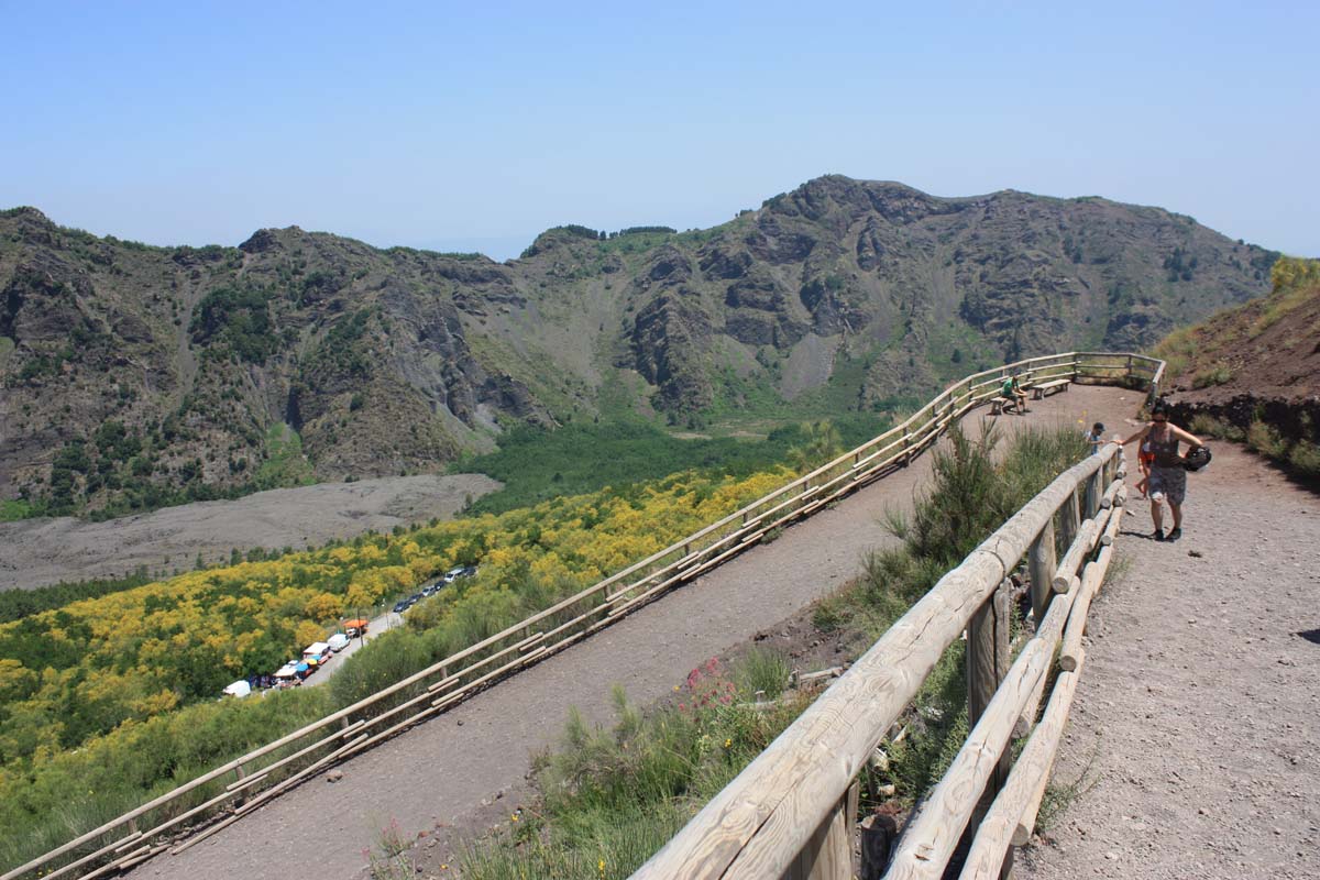 To se pokazalo dobrim odlukom. Vozeći nekih 10 km zapadnije, od lokalnog stanovništva dobili smo uputu kojim putem trebamo poći. Po cesti sa koje se pruža panoramski pogled na Napoli popeli smo se do parkinga nekih 1000 m od vrha Vezuva. Tu vežemo motor za ogradu i čuvarima plaćamo 2 eura za parking. Počinjemo težak uspon po prašnjavoj stazi koja se poput zmije strmo penje k grotlu. More turista svako malo ostaje bez daha. I mi se često odmaramo. Za ilustraciju reći ću vam da smo tih 1000 m hodali oko 45 minuta i tom prilikom popili 3 l tekućine.