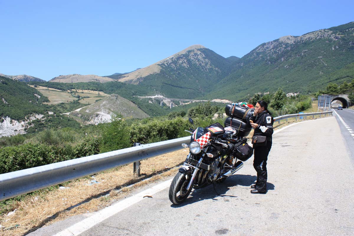 Ovdje u apeninskim brdima dosta je hladnije pa je vožnja puno lakša. Budući da se tu nalazi križanje nekoliko auto strada navigacija nam se malo pogubia pa nas jedan dio puta vodi prema Pescari. Dodala nam je nekih 80-tak km u ukupnom putu. No sve je OK jer je cesta odlična. Prekrasni su planinski pejzaži i prjevoji oko Gran Sasso d Italia.