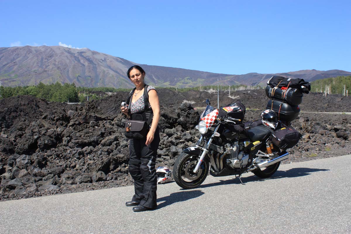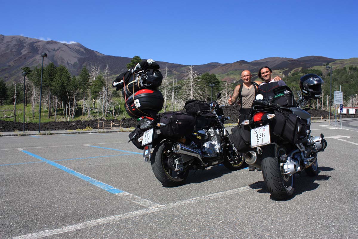 Cijeli dan sam se smijao tome: on će rišit problem. akujemo se i odlazimo put Etne. Etna je najveći aktivni europski vulkan i dominira istočnom stranom otoka. Visoka je 3330 m i pripada skupini najaktivnijih svjetskih vulkana. Rijetki su dijelovi Sicilije s kojih Etna nije vidljiva, a i u njima ćete teško zaboraviti na njezinu zastrašujuću pojavu i prisutnost. Izvrsnom cestom penjemo se prema Etni. Oko nas zuje dečki na R-ovima koji se ovdje utrkuju vikendom. Svi su maksimalno opremljeni i odlično voze. Mi se sa svojim tankerima natovarenim do vrha teško vozimo kroz ovaj raj. Alen si je dao malo oduška pa je pojurio naprijed, a mi ovako natovareni nismo ga mogli pratiti.