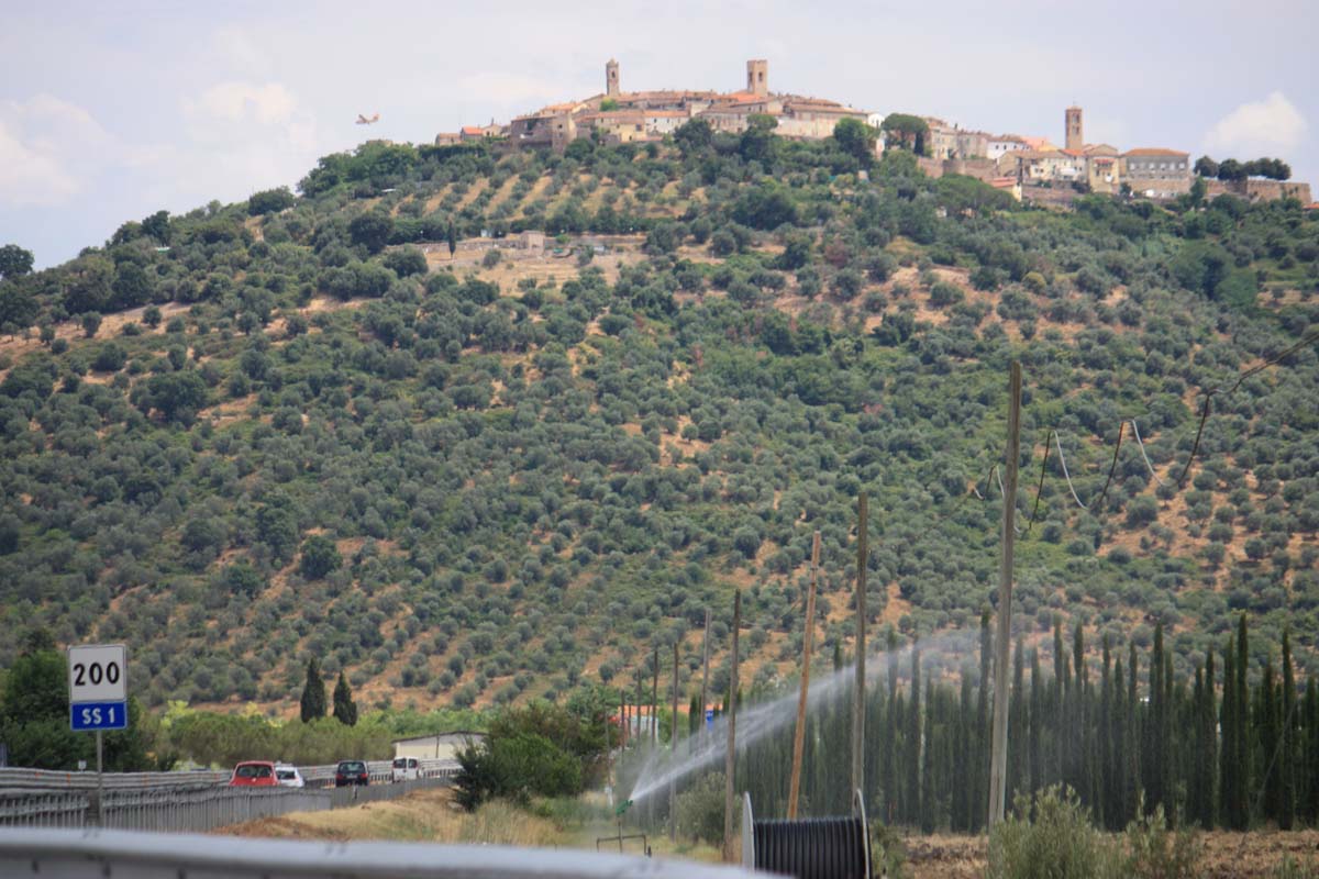 Pogled sa brda je nazaboravan pa maksimalno koristimo blagodati digitalne fotografije. Vrijeme se malo namrštilo i nije za plažu stoga se vraćamo u Marinu di Grosseto gdje se prepuštamo jelu i pilu u campu. Stari Capo prolazi kraj našeg stola uglavnom uvijek kad jedemo, pa zastaje i kaže: sempre manđare,... basta manđare!!!!! Sprema se nekakav Tsunami, a mi smo još uvjek jedini sa šatorom u campu. Svi skidaju tende sa kampera i sa suosječanjem gledaju u nas. Susjedi Talijani Ilarija i Norman pozvali su nas k sebi ako bude oluje. Još se ništa ne dešava pa odlazimo do grada u potrazi za novim šatorom ako nam bude potreban. Dok parkiramo pred trgovinom prilazi nam jedan mlađi lik, pozdravlja nas i pita jesmo li iz Hrvatske. Ugledao je naljepnicu Moto Pulsa koju imamo na vjetrobranu. Kaže da dolazi kod nas na Grobnik i u Rijeku, i da povremeno lista najbolje moto novine na svijetu MOTO PULS, naravno kada ih uspije pribaviti. Vidim da dosta zna o našem Kvarneru a o Grobniku gotovo sve. Nevjerovatno, Talijan iz središnje Italije čita(predpostavljam, lista) Moto Puls i vozi po Grobniku. E svaka čast. Grlimo se s njim i odlazimo svojim poslom. Šator smo našli ako nedaj bože ustreba. Vrijeme se malo smirilo.
