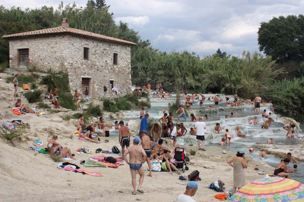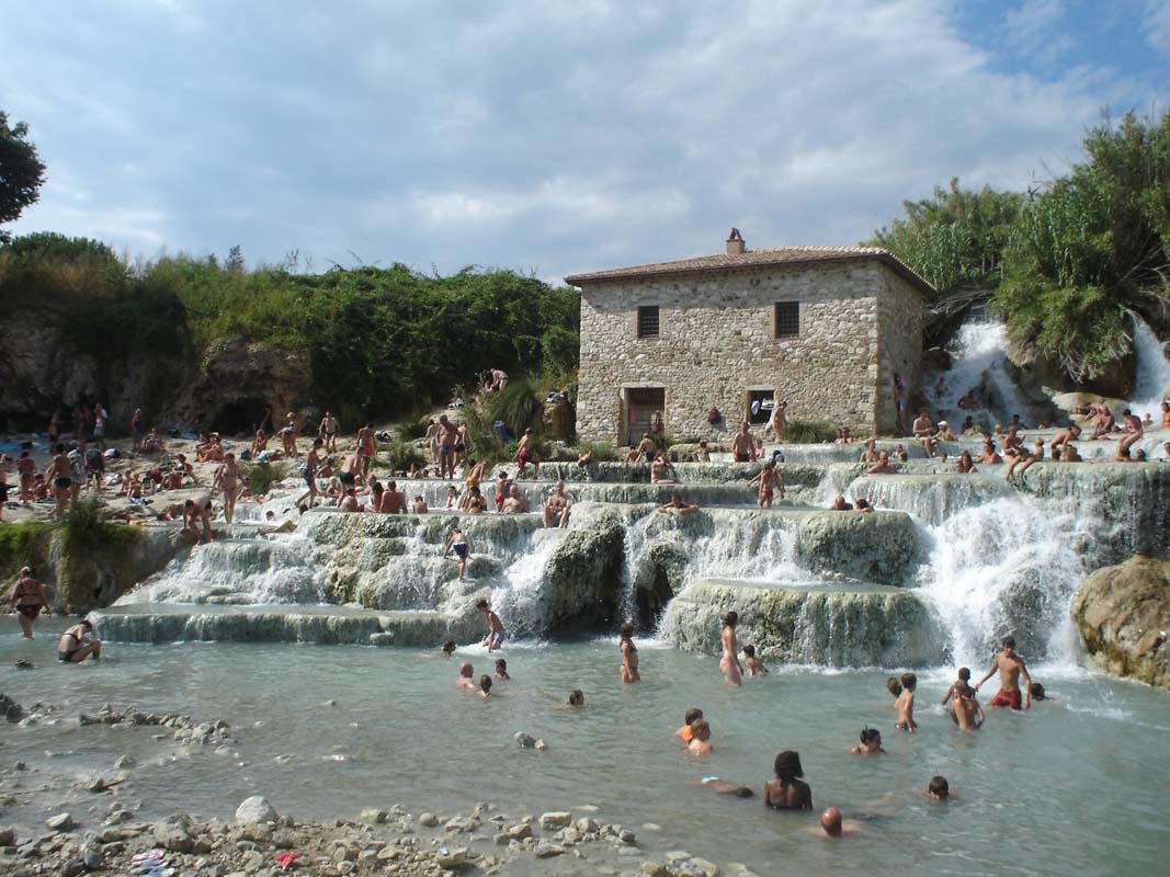 Nakon sat i pol stižemo pred Pitigliano. Vidikovac na rubu ponora nasuprot gradu obavezna je stajanka za sve koji odavde prolaze. Ovaj pogled se nemože opisati riječima. Grad se uzdiže doslovce iz stijena i doima se gotovo nestvarno. Kraj jedne fontane se rashlađujemo, a potom uskom brdskom cestom odlazimo do Sorana. Gotovo je identičan Pitiglianu i doslovno se skliže sa svoje stjenovite hridi. Slijedeće mjesto na našem putu je Sovana. Ovaj skromni zaselak je rodno mjesto Pape Grgura VII iz 11. stoljeća. Na glavnom trgu nalaze se srednjevjekovni Palazzo Pretorio i crkva Santa Maria sa freskama iz 15 st. Po okolnim brdima i dolinama nalaze se mnoge etruščanske grobnice. Kruna našeg izleta ovoga dana svakako je Saturnia. To je mjesto sumpornih izvora čija topla voda i blato bogato mineralima od antičkih vremena pomažu koži i dišnom sustavu. Tu su i istoimene toplice pored kojih prolazimo i zavojitom se cestom spuštamo do Cascata del Gorello nekih dva kilometra južnije. Ovo je zaista fantastično. Iz velike stijene šikljaju dva golema izvora tople vode. Stepenasto se preljevaju preko mnoštva cascada praveći male bazenčiće u kamenu te se slijevaju niz dolinu u toplu riječicu. Ovdje se banjamo sa mnoštvom turista do kasno popodne. Čak nam se pred kraj dana ovdje ukazao nekakav Isus. Sav istetoviran i u nekim krpama s prekriženim rukama izašao je iz Peace Brother kombija sa svojim društvom nalik na apostole i sa dvije peace sestrice. Taj vrlo loš replikant izgledao je kao da će u najmanju ruku održati Govor na Gori. Umjesto toga zapalio je joint i kada je povukao par dimova otišao je kako je i došao.“ Apostoli“ i dvije sestre odoše za njim. U drvenjari pored ovog raja pijemo Italiano esspreso i Coca-colu.