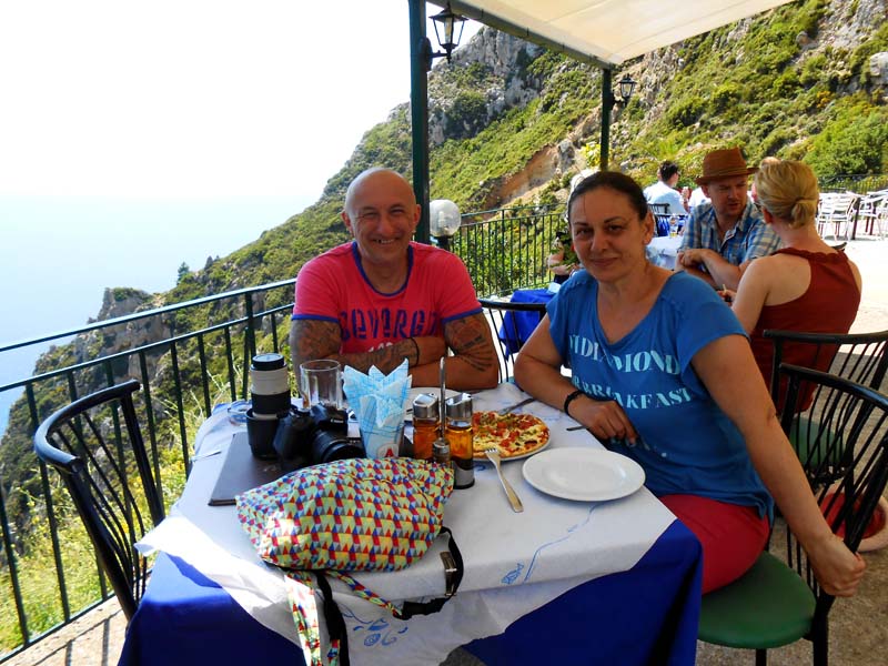 Zbog ovakvih remek djela prirode prolazni život na zemlji ima smisao i daje mu istinsku vrijednost. Ovdje u Lakonesu s malene terase koja sjedi na hridi iznad mora, u minijaturnoj taverni prepuštamo se slasnim zalogajima i vinu koje su nam poslužili baka i djed,vlasnici ovog lokalčića. Sve što jedemo i pijemo uzgojeno je na ovom teško pristupačnom mjestu što daje posebnu notu ovom užitku. Ovdje smo doživjeli i nešto što je rijetko gdje moguće. Na moj upit za jelovnik odnosno menu odgovorili su nam da se ništa nebrinemo jer oni dobro znaju što će nam donjeti za stol. Dok djeda pitam zacijenu on mi odmahuje rukom i govori : ne brini neće biti skupo. Nakon mezetesa,specijaliteta u vidu raznih salata,ribica,pršuta i vina ukupan račun iznosio je 4 eu. Baka nam je još u salvetu spremila malo sušenog origana,dakako iz vlastitog uzgoja kakav se ne nalazi u trgovinama. Nakon zagrljaja s ovih dvoje jednostavnih i dragih ljudi odlazimo do nedaleke bizantske utvrde Angelokastro koja se uzdiže na stjenovitoj hridi što strmo ponire u modro more. Uspon do ove utvrde iziskuje dosta kondicije,no nakon što smo se zadihani i mokri od znoja popeli do nje usljedila je nagrada za uloženi trud u vidu pogleda koji je teško opisati riječima.