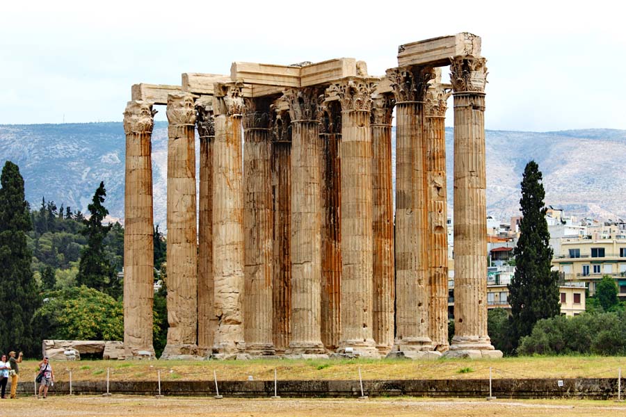 Ovo veličanstveno zdanje vladaru Pantheona bilo je najveće na Grčkom kopnu. Od prvotna 104 ogromna stupa danas ih je ostalo samo 16. Dva kolosalna kipa od zlata i slonovače krasila su unutrašnjost hrama. Jedan je prikazivao Boga a drugi rimskog cara Hadrijana. Gradnja ovog hrama počela je 515 god. pr. Kr. no zbog političkih prilika u zemlji završila je tek 700 god kasnije. Kako bi caru Hadrijanu zahvalili što je gradnju priveo kraju Atenjani su 131 god izgradili dvokatni luk njemu na spomen. Hadrijan je na zapadnoj strani ovog luka dao uklesati natpis : „Ovo je Atena drevni Tezejev grad“ a na istočnoj strani uklesao je : „Ovo je Hadrijanov a ne Tezejev grad“razlikujući na taj način legendu od stvarnosti (ha,kakav lik taj bajo Hadrijan). Legendi je na ovim prostorima doista puno pa kada smo već ovdje spomenimo ih nekoliko. Jedna se odnosi na rođenje Atene i govori o tome da kada jeZeusova ljubavnica Metida zatrudnjela,Zeus je saznao da će roditi sina koji će ga svrgnuti s prijestolja. Kako bi to sprječio,progutao je Metidu,ali je nerođeno dijete nastavilo rasti u njegovoj glavi. Nakon 9 mjeseci Hafest je sjekirom Bogu raskolio glavu pa je iz nje iskočila djevičanska božica Atena,već u punom oklopu.