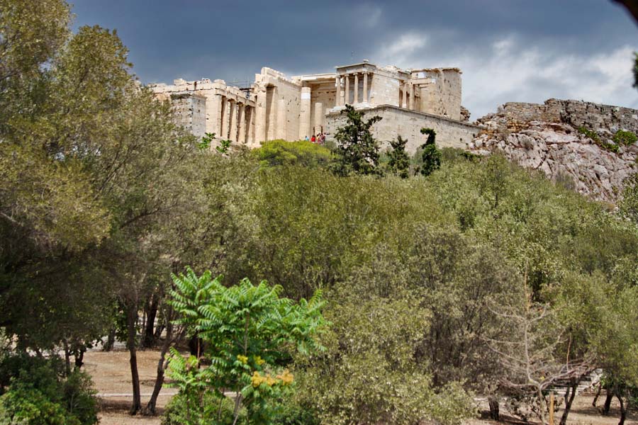 Zaustavljamo se ispod „Svete Stijene“ i hramova koji se smatraju najvažnijim spomenicima zapadnog svijeta, zbog toga što su oni imali najveći utjecaj na zapadnjačku arhitekturu. Većina ovih mramornih remek djela podignuta su tijekom Periklove vladavine u drugoj polovini 5 st. pr. Kr. u tkzv. zlatnom dobu Atene. Većina ih je posvećena Božici i zaštitnici grada Ateni. Tek što smo sišli s motora,uzeli foto opremu u ruke i pogledali štetu na bočnom koferu crni oblaci su se nadvili sa svih strana. Nije trebalo dugo čekati da se iz njih izlije tolika količina vode kakva se rijetko može vidjeti. Kao prekaljenom uživaocu kiše na motoru prvo što mi je palo na pamet bila je misao :“pa ti gdje god da odeš sobom nosiš kišu pa eto i u uvijek sunčanu Grčku“. Diosta nevjerovatno. Lije kao iz kabla. U jurišu pokušavamo spasiti što se spasiti može no već je prekasno jer kiša nas je doslovno potopila. Jedino fotiće i objektive uspjevamo zaštititi a tank torba,jakne i ostala oprema izgledaju kao da su izašli iz perilice rublja bez centrifuge. S ostalim turistima ispod neke strehe čekamo oko sat vremena da se situacija malo smiri.