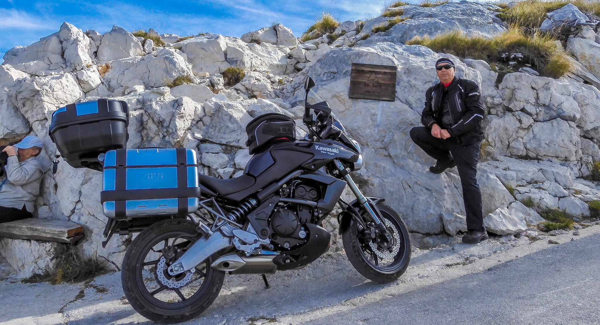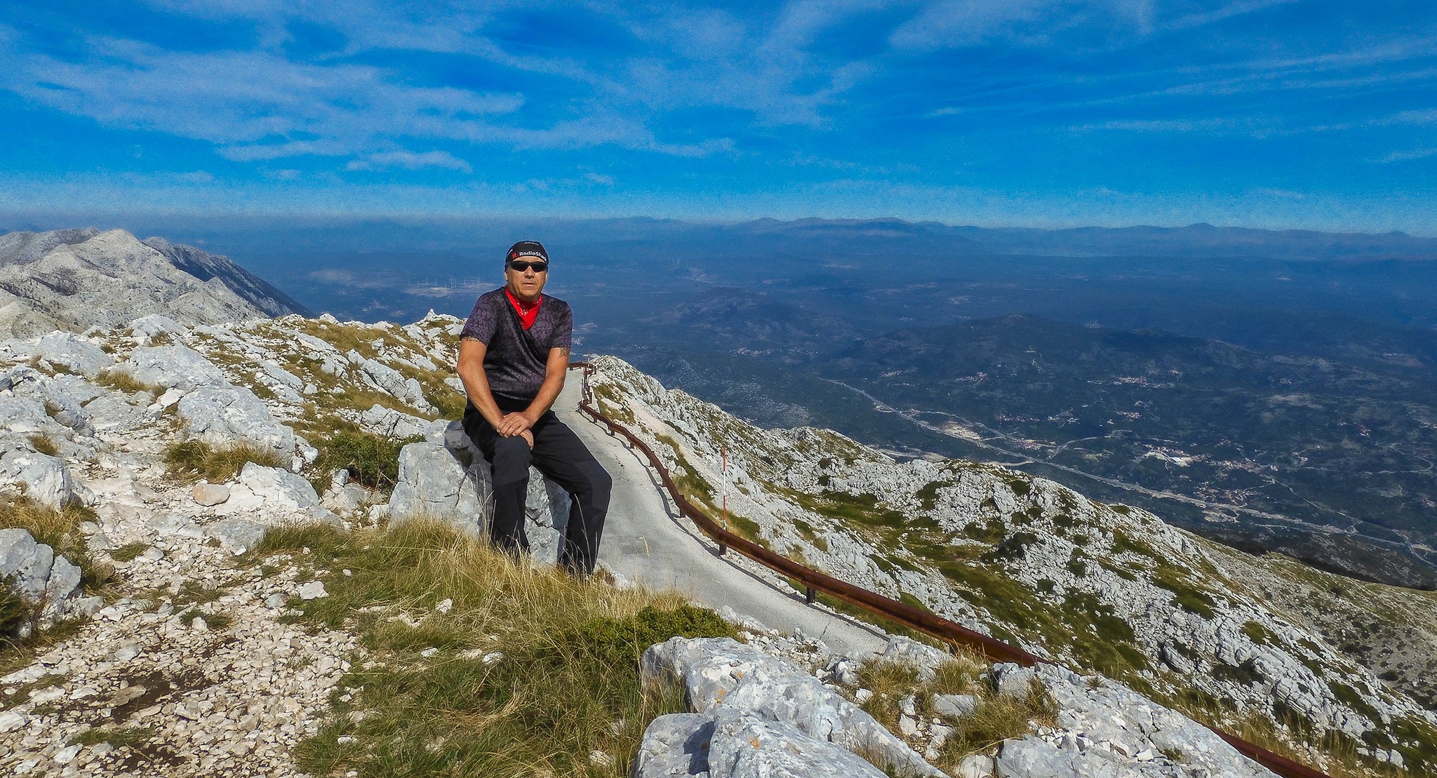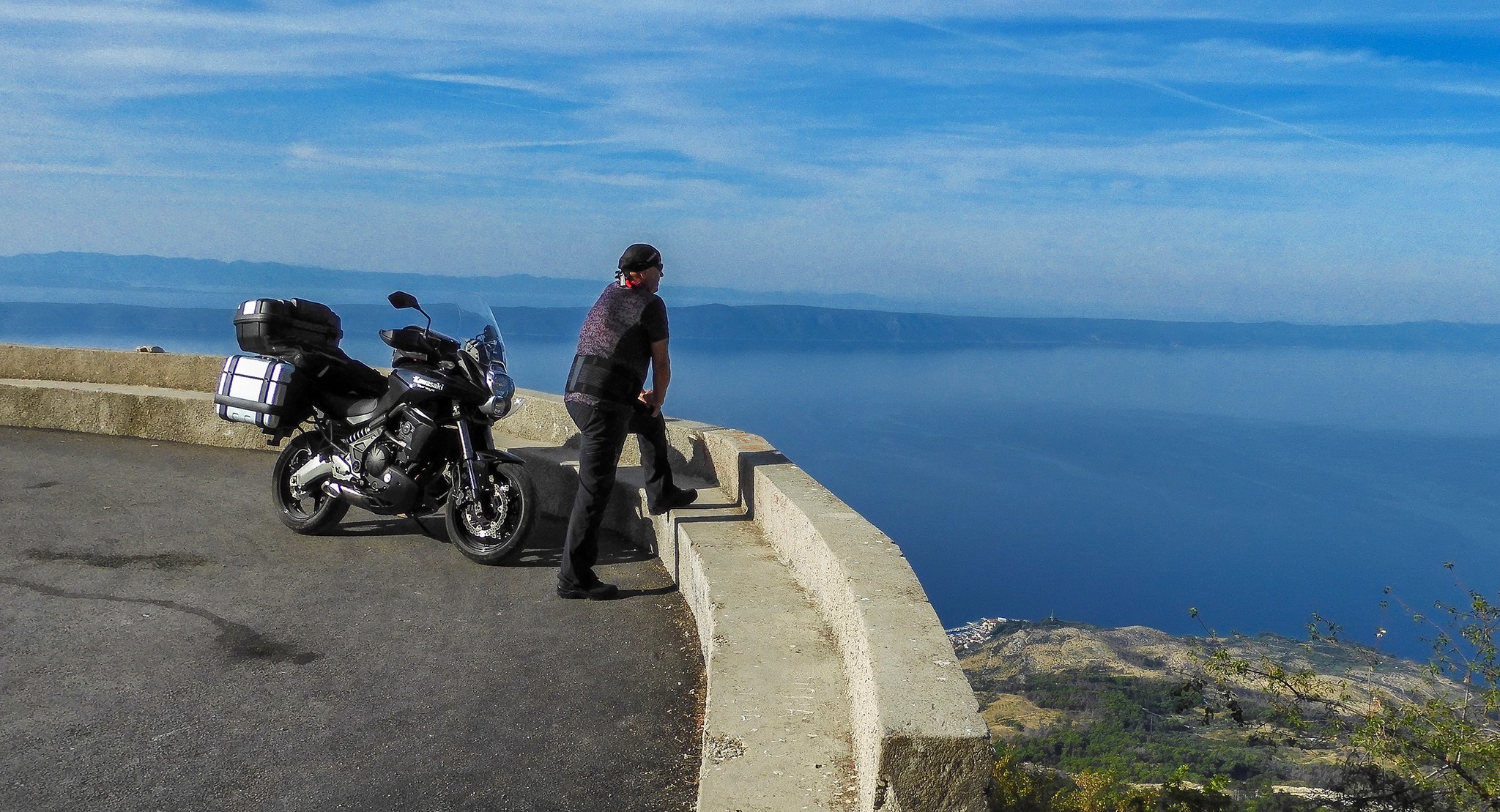 Nakon što sam prošao Vrata Biokova cesta se dodatno suzila i nastavila vijugati između kamenih gromada i vrtača. Na mjestu gdje je bio stari zidani vidikovac sagrađen je novi koji ima stakleni pod nad provalijom od nekoliko stotina metara. Naravno da sam zastao i prošetao po tome čudu neviđenom. Vrlo brzo, nakon planinarskog doma „Pod javorom“ ukazao se kameni odvojak prema još jednom vidikovcu. Nisam štedio motor i prošao sam tim kamenjarom 200-tinjak metar da bi došao do samog ruba litice iznad Makarske. Neprocjenjivo.