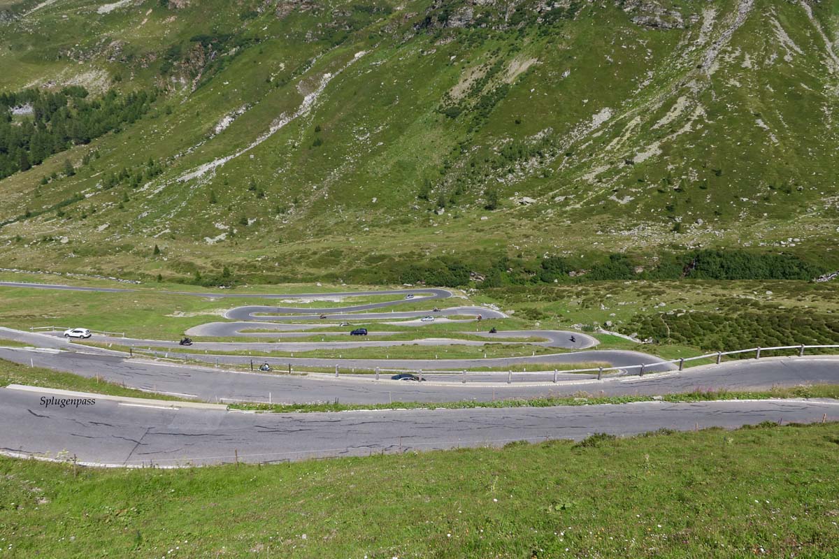 Na vrhu, ugodna atmosfera, opet uz jezero. Spuštam se prema Splugenu, mjestu iz kojeg kreće uspon na Splugenpass. Tu kroz šumu i oštre zavoje izlazim na ravniji i pregledniji dio, prije nego krenu serpentine, koje su tako pravilno postavljene da takvo nešto nisam nigdje vidio. Kao u nekom moto trening kampu gdje žele da naučite kako prolaziti serpentinama i kao da vam netko stalno govori: “ponovi”!