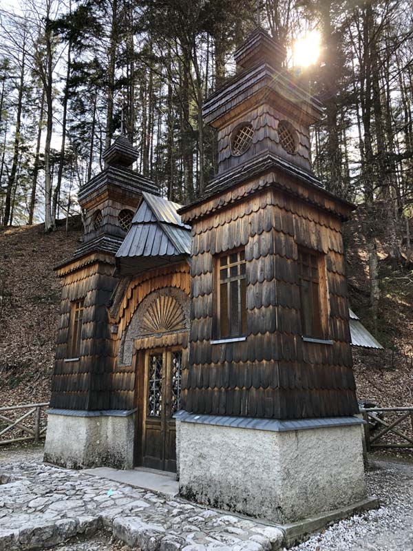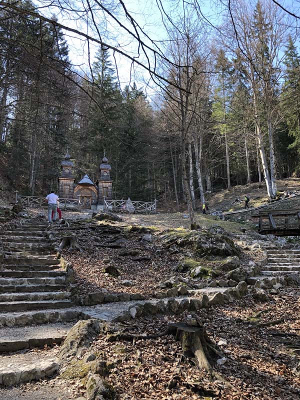 I tako stižemo na vrh, pri čemu treba napomenuti da je ovaj prijevoj visok 1.611 metara zvan i Ruska cesta jer su je, uz visoku cijenu, sagradili ruski vojnici koji su bili ratni zarobljenici Austrougarske Monarhije u 19. stoljeću. Nitko ne zna točan podatak, ali pretpostavlja se da je oko 380 ljudi poginulo što od lavina što od hladnoće, o čemu najvjernije svjedoči kapelica na 1.200 mnv pri spuštanju prema Kranjskoj gori. Nju su sagradili ruski zarobljenici i baš zato je zanimljivo stati i pogledati sasvim drugačiju i atipičnu kapelicu za ovo područje.