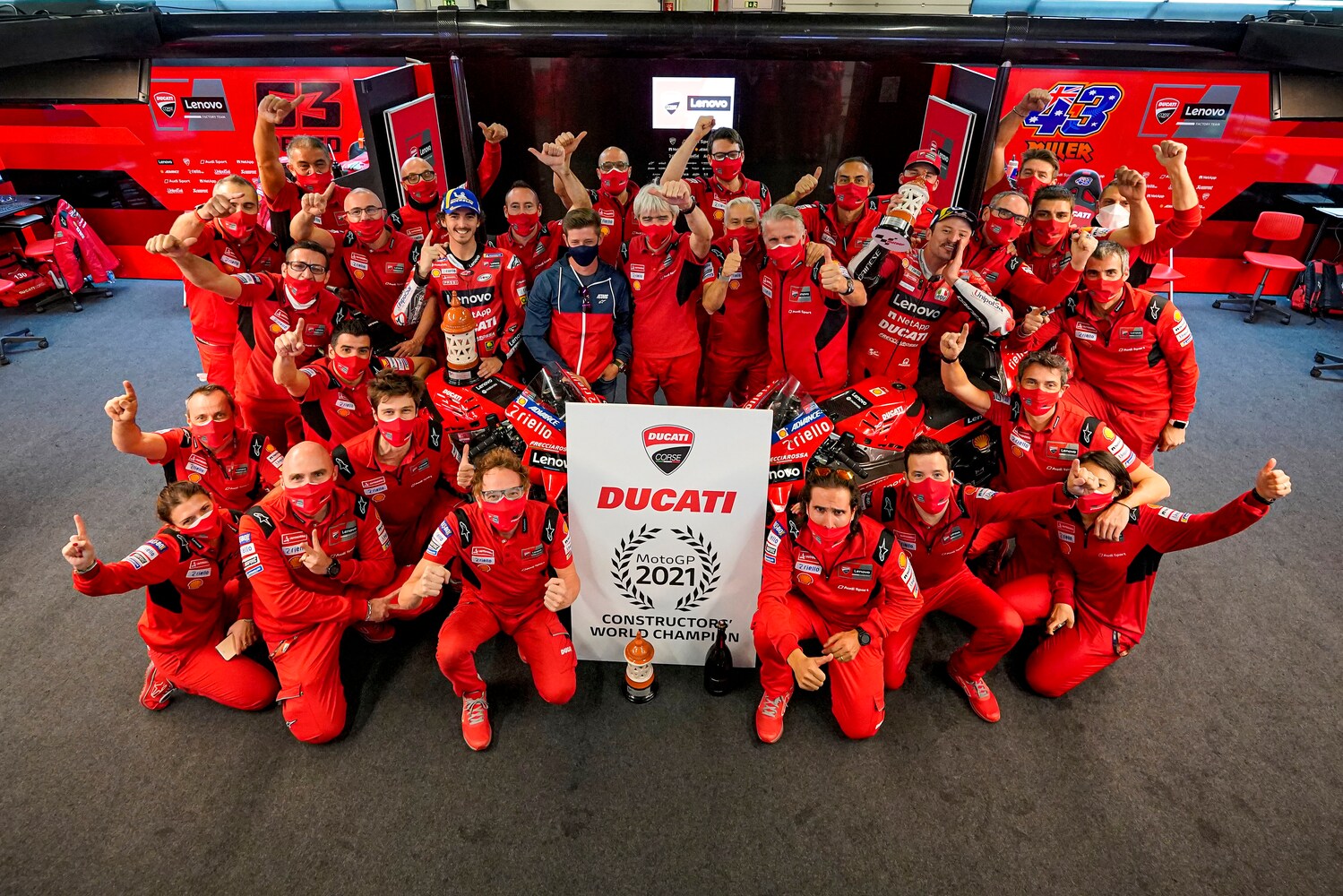 Zahvaljujući još jednoj senzacionalnoj pobjedi Pecca Bagnaie na Autodromo Internacional do Algarve u Portimãu (Portugal), Ducati je drugi put zaredom osigurao MotoGP Svjetsko prvenstvo konstruktora, jednu utrku prije kraja sezone 2021. Talijanski proizvođač danas je osvojio svoj treći naslov svjetskog prvaka u premijernoj klasi na Grand Prix Brembo u Algarveu, na istoj stazi na kojoj je prošle godine osigurao svoju drugu titulu, 13 godina nakon prve.
