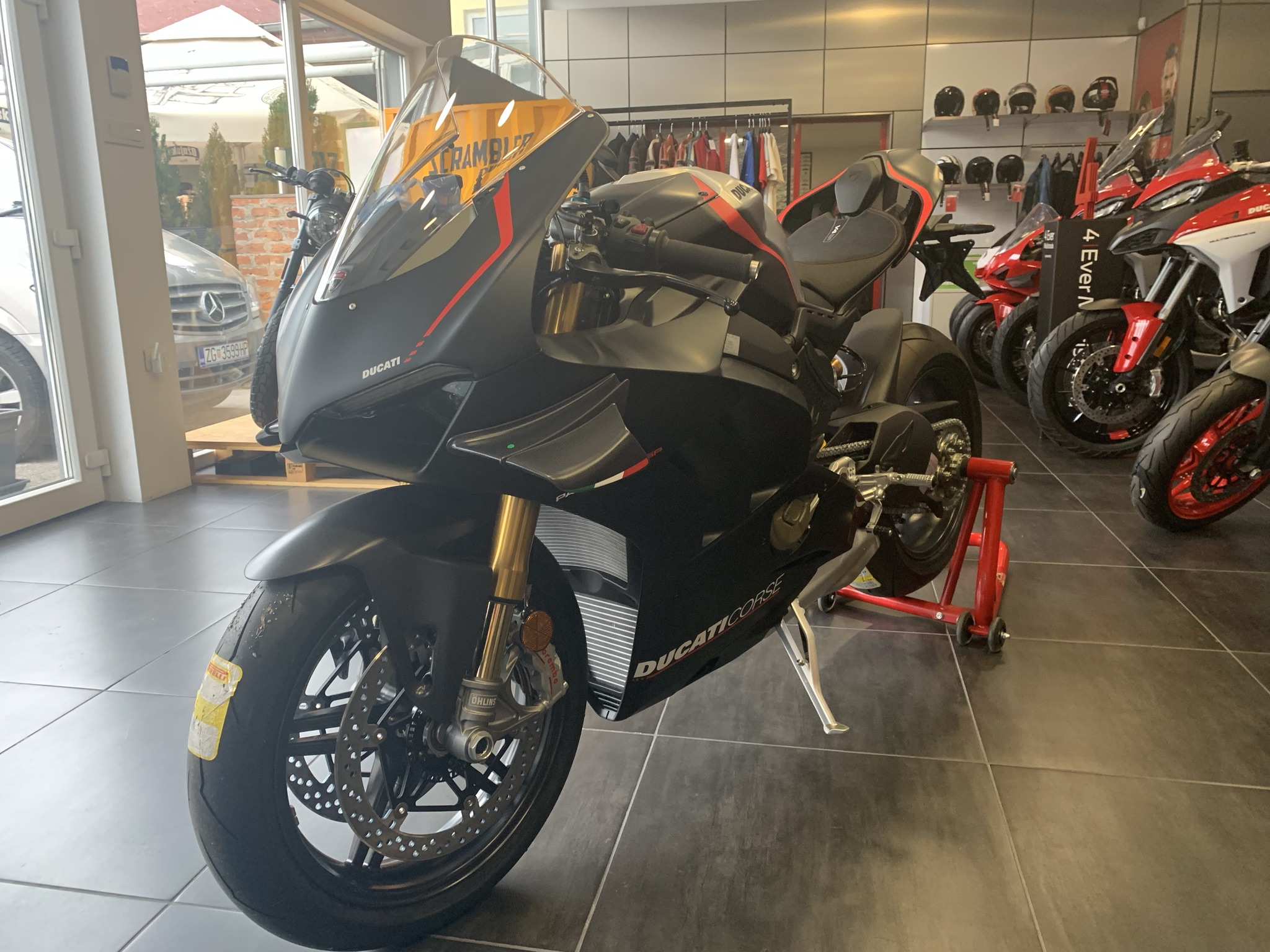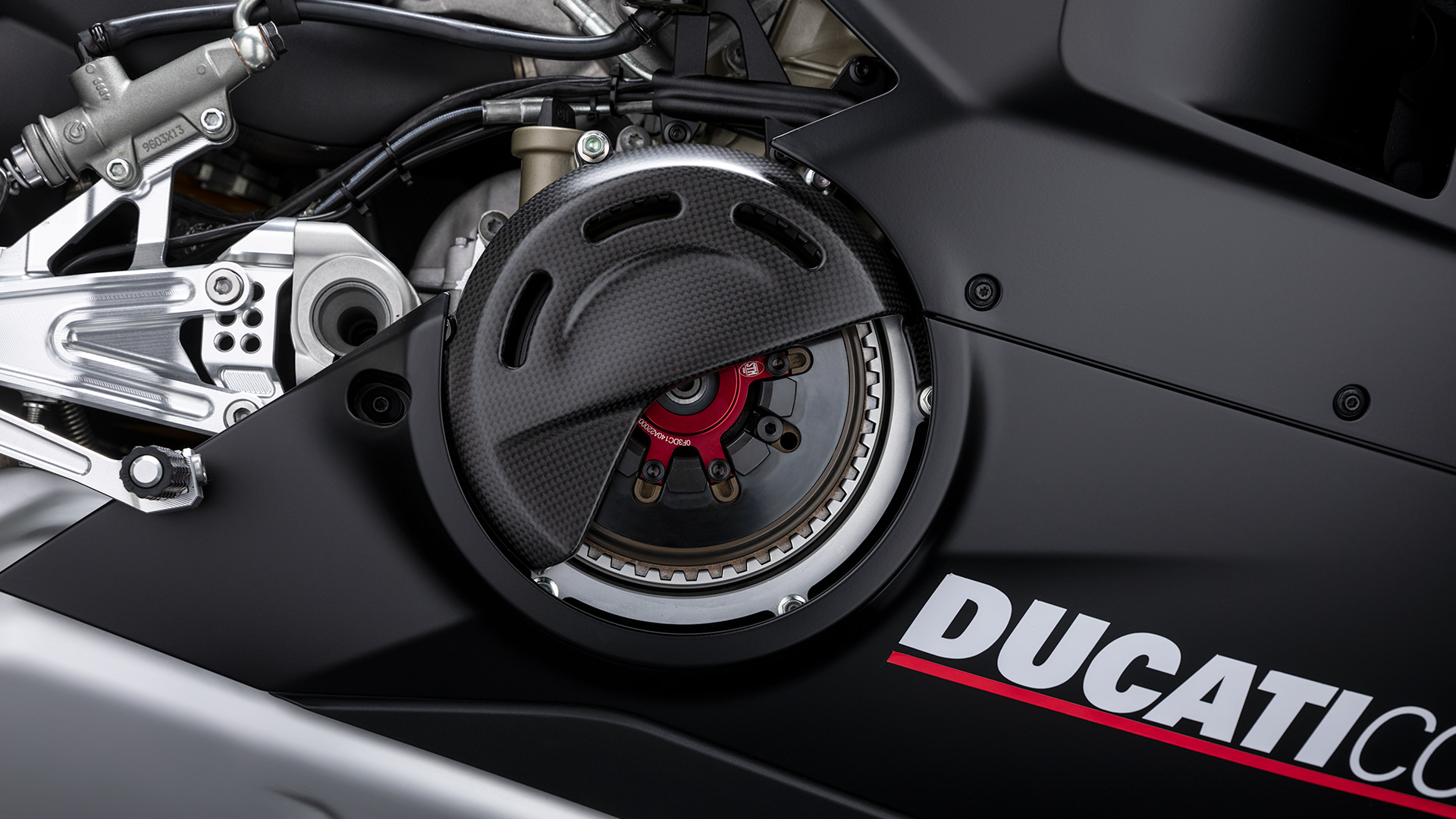 - STANDARD EQUIPMENTDucati Power Launch (DPL), Ducati Quick Shift (DQS) up/down EVO 2, Full LED lighting with Daytime Running Light (DRL), Ducati Electronic Suspension (DES) EVO with Öhlins suspension and steering damper, Quick adjustment buttons, Lithium-ion battery, Auto-off indicators, Racing style handle grips, Chain guard, Carbon fiber wheels, Carbon fiber front mudguard, Wings in carbon fiber, Adjustable rider footpegs in aluminium with heel guard in carbon fiber, Billet aluminium steering stem with bike number.