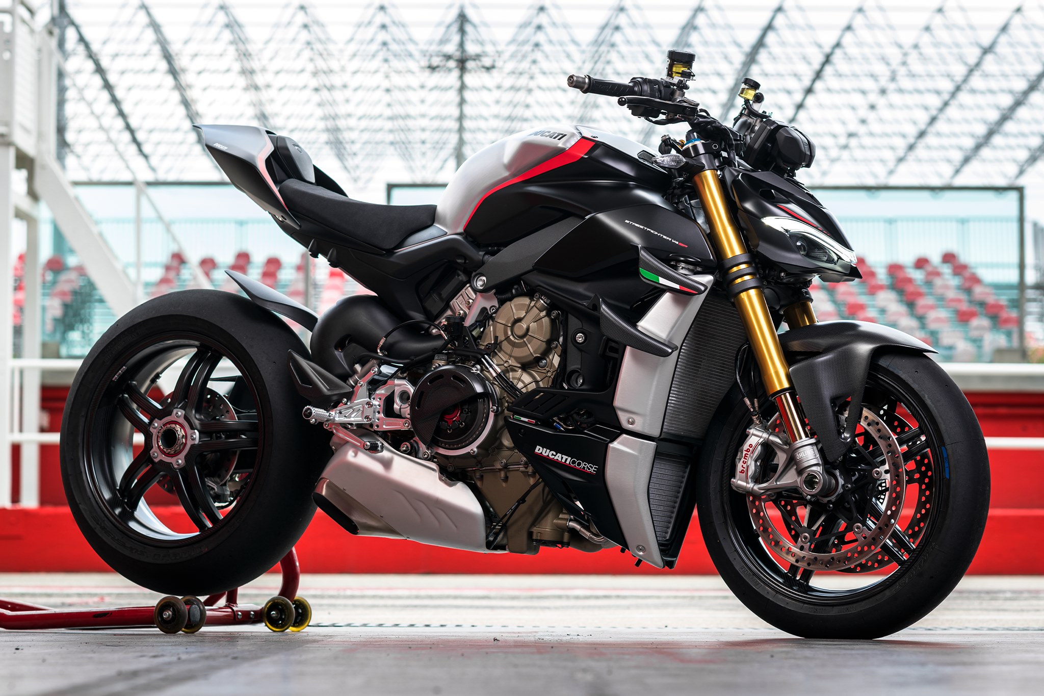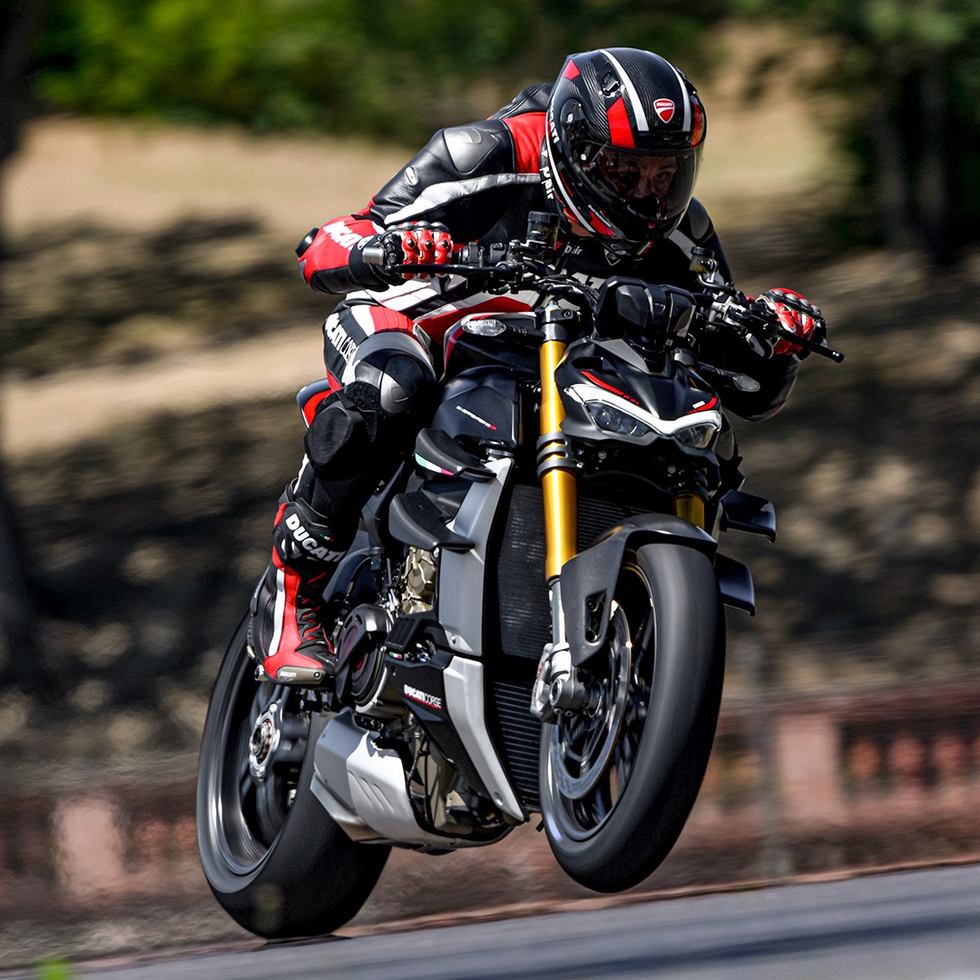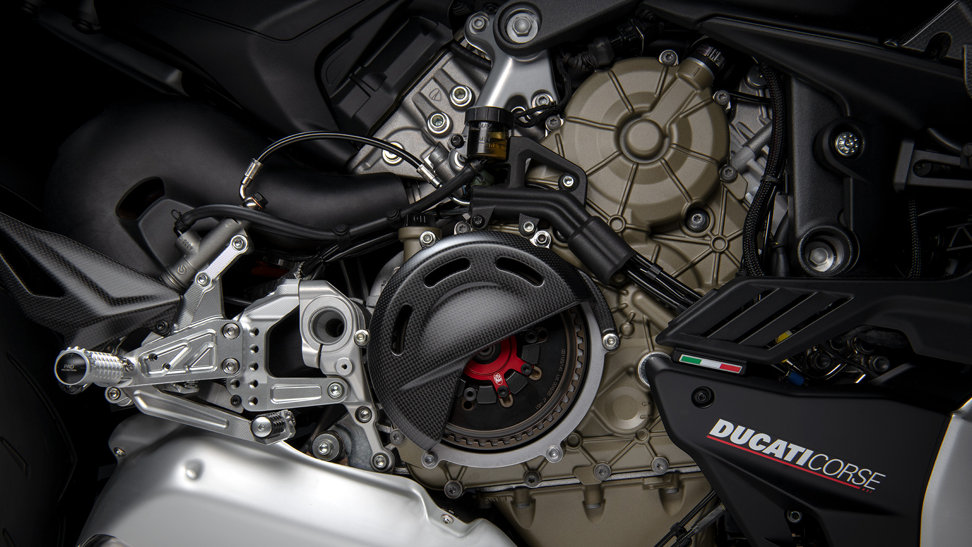 Novi karbonski naplatci, 1,4 kg lakši od onih na Streetfighteru V4 S, značajno smanjuju moment inercije i doprinose ukupnoj uštedi težine od 3 kg. Motor Desmosedici Stradale obujma 1103 ccm ima proturotirajuću radilicu, “Twin Pulse” redoslijed paljenja, 208 KS snage i 123 Nm okretnog momenta pri 9500 o/min. b osigurava učinkovitiju funkciju protiv skakanja, ali također reproducira karakterističan zvuk koji Ducatisti toliko cijene. Sveobuhvatan asortiman opreme upotpunjen je ovjesom Ohlins Smart EC 2.0 i kočionim sustavom Brembo Stylema R® s prednjim čeljustima.