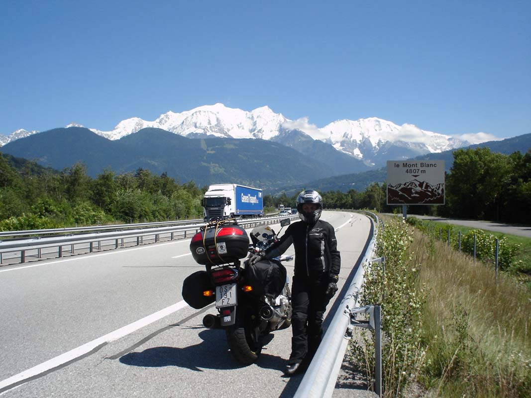 Put nas vodi ka Maconu na čijoj ćemo se periferiji odvojiti lijevo prema Genevi. Na jednoj benzinskoj pumpi susrećemo 10-tak Francuskih policajaca koji voza Yamahe FJR. One su službena vozila Francuske policije. Motocikli su potpuno novi i vjerojatno su ih vozili u neki veći grad. Pošlepali smo se iza njih jer nisu vozili ispod 180, tako smo dobar dio puta prevalili u teškom prekršaju ali pod pratnjom zakona. Može li ljepše. Kod Geneve plaćamo prvu cestarinu 27 €. Put nas dalje vodi ka Chamonixu i tunelu Mont Blanc.