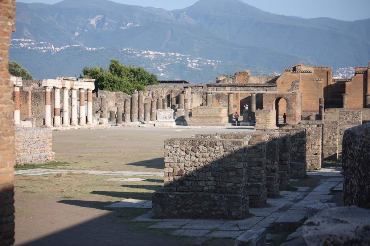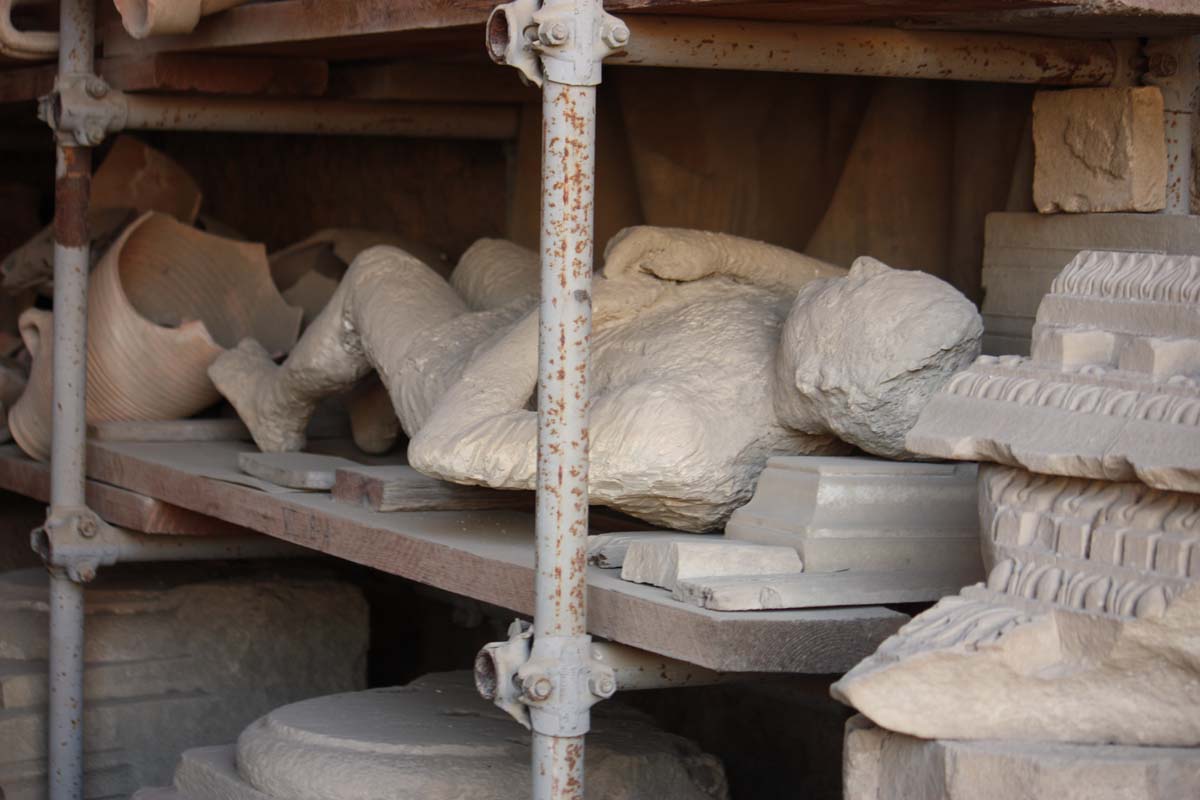 Nakon dugog hodanja po ruševinama stigli smo do glavnog trga. Očekivali smo da ćemo uz put vidjeti okamenjene ljude i životinje u trenu kada ih je zatekla nesreća erupcije vulkana. Svi oni su međutim premješteni u nekakvo improvizirano skladište i poslagani na police kao figure zajedno sa iskopanim predmetima iz svakodnevnog života onog doba. Povremeno bacim pogled na 20-tak km udaljeni Vezuv i izgleda mi nemoguće da je uspio takom brzinom i tako daleko dobaciti sadržaj svoje utrobe do ovih nesretnika.