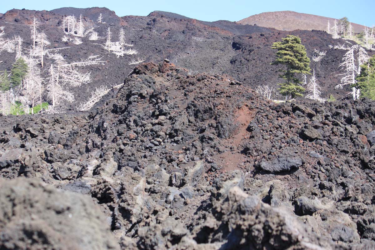 Napokon dolazimo u samo podnožje vulkana odakle je do vrha moguće doći jedino terencima ili vučnicom. Odlučili smo ne ići do kratera nego vulkan poslikati odavde. Izgubili bismo cijeli dan a za to nemamo vremena. Oko nas su kilometri i ogromna brda ohlađene lave i vulkanskog kamenja koje je Etna izbacila. Cesta je izgrađena kroz ta brda koja su nastala erupcijama Etne. Okolno drveće i sva vegetacija izgorjelo je poput šibica. Djeluje zastrašujuće.