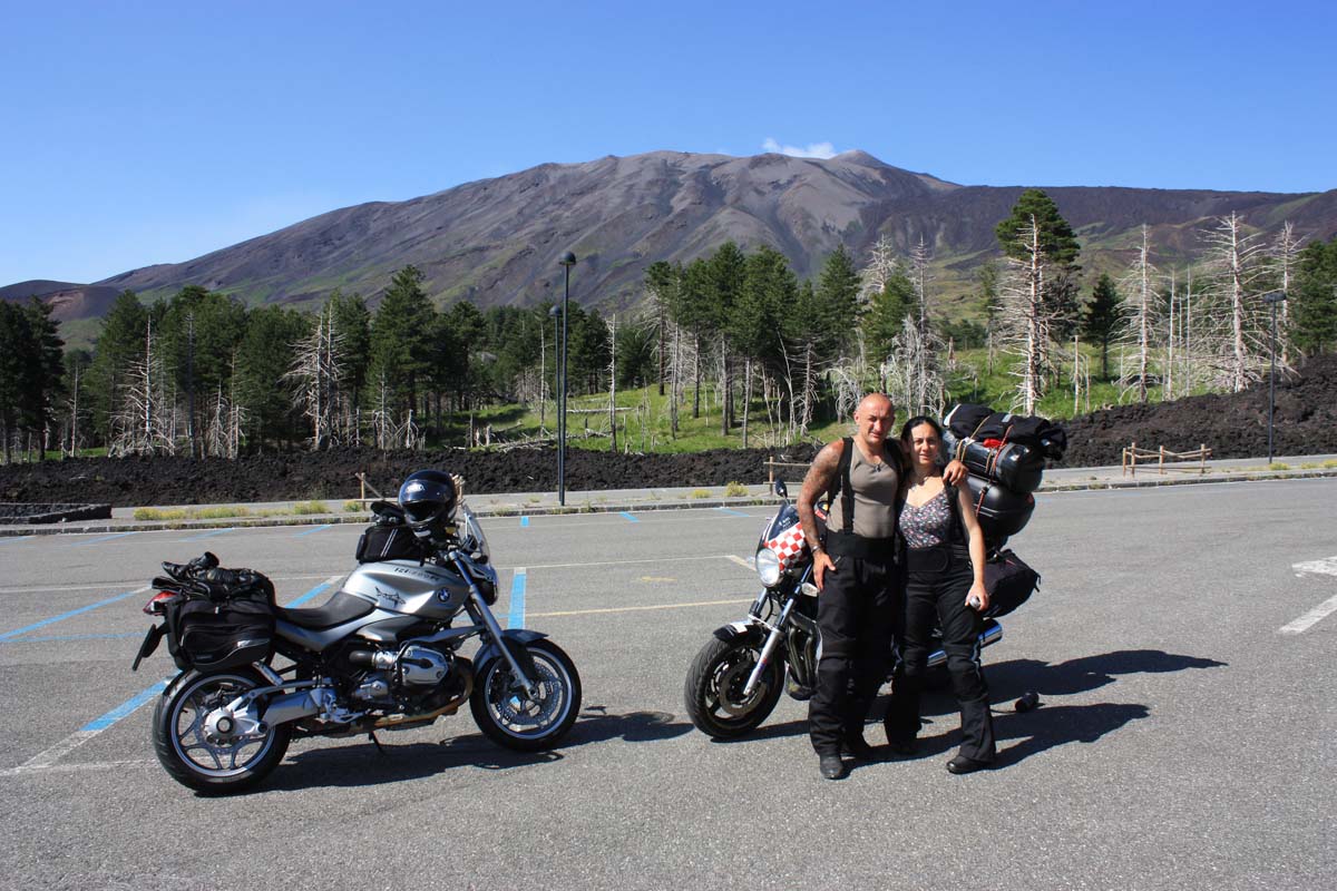 Cijeli dan sam se smijao tome: on će rišit problem. akujemo se i odlazimo put Etne. Etna je najveći aktivni europski vulkan i dominira istočnom stranom otoka. Visoka je 3330 m i pripada skupini najaktivnijih svjetskih vulkana. Rijetki su dijelovi Sicilije s kojih Etna nije vidljiva, a i u njima ćete teško zaboraviti na njezinu zastrašujuću pojavu i prisutnost. Izvrsnom cestom penjemo se prema Etni. Oko nas zuje dečki na R-ovima koji se ovdje utrkuju vikendom. Svi su maksimalno opremljeni i odlično voze. Mi se sa svojim tankerima natovarenim do vrha teško vozimo kroz ovaj raj. Alen si je dao malo oduška pa je pojurio naprijed, a mi ovako natovareni nismo ga mogli pratiti.