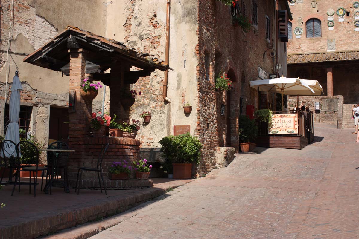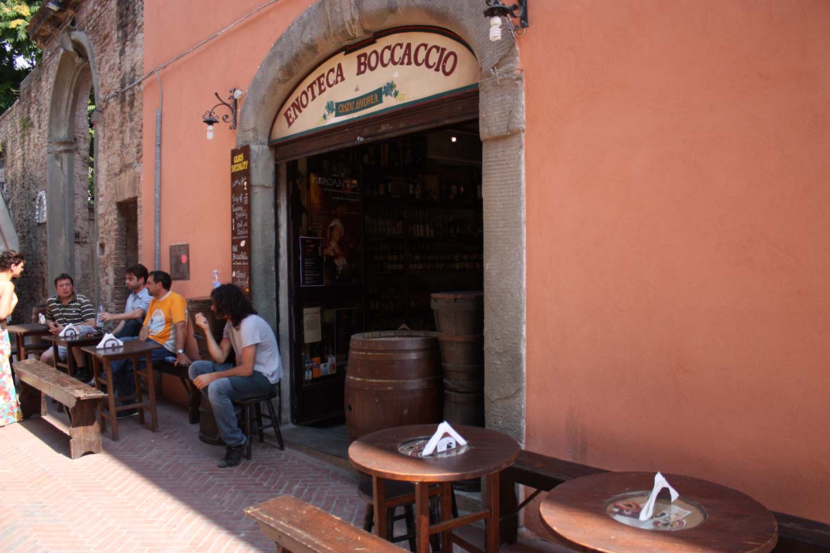 Nakon mukotrpnog uspona nagrada je uslijedila u enoteci Boccacio nasuprot rodne kuće i muzeja slavnog autora Decamerona, Boccacia. Tv serija Decameron se emitirala kada sam ja bio mali dječak. Sjećam se samo nekih golih teta koje su trčale i skakale u masivnoj kutiji koja se i onda zvala televizor. Razlika je što su tete tada bile u onda jedinoj crno bjeloj boji. Kada bih bio na selu kod bake u vrijeme emitiranja Decamerona ona bi odmah prebacila Tv program sa Zagreba 1 na Zagreb 2 koji je bio jedini alternativni, ali učinkovit protiv ovakvih zala. Naravno slijedilo bi križanje i pokoji očenaš. Dakle osvježenje smo pronašli u čuvenoj enoteci, a nakon okrijepe i obilaska ovog gradića spuštamo se 20-tak km južnije do San Gimigana. On je drugi na top ljestvici Toscanskih odredišta. Puno ime mu je San Gimignano Delle Belle Torri (grad lijepih tornjeva). O bogatstvu tog srednjevjekovnog Manhattana svjedočilo je 70 tornjeva od kojih se sačuvalo njih 14. Grad je pun umjetnina iz 14 i 15 stoljeća. Sve je puno turista koji se guraju po ulici i po suvenirnicama.