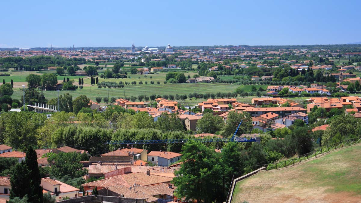 Nekih 8 km u brdima stali smo slikati predivnu panoramu Pise koja se odavde vidi u svoj svojoj raskoši. Prilično je vruće pa se danas kao i prethodnih dana vozimo samo u majicama i kratkim hlačama Rezultat toga je da smo prilično izgorjeli na suncu tj. skupljamo boju na cesti umjesto na plaži. Dolaskom do Lucce cesta se penje još više u brda gdje na puno mjesta presjeca brdsku riječicu. Kilometar po kilometar i evo nas, Borgo A Mozzano.Selo je pusto kao da je pomor, samo pred jednom kućom sjedi par staraca.