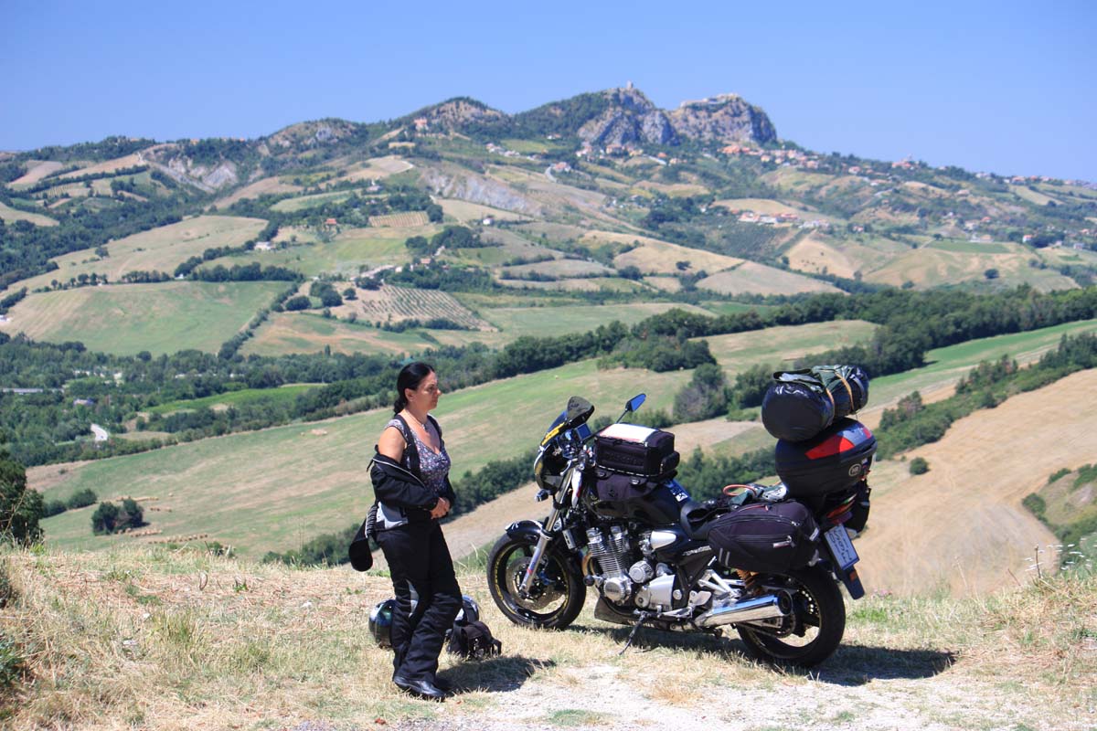 Kod Arezza se odvajamo prema San Marinu. Ovdje počinje prava golgota zbog ceste koja je toliko loša i uska da bi i momci sa enduro motorima imali dosta muke. Priroda je predivna, ali kao da nije dala mogućnosti da se njome prođe bez puno truda. Kako je jedan frend davno rekao „sve sama jama budi bog s nama“. Zaključujem da smo brže napredovali 1943. prema Staljingradu. Na nekakvim kolcima pribijenim uz put stoji natpis Rimini. Držimo se putokaza kao pijan plota i nakon 50-tak km kroz ovo bespuće izbijamo na odličnu cestu ispred San Marina. Dok se uspinjemo cestom u grad pred nama se otvara panorama kakva se rijetko viđa. Osjećaj je kao da nismo na zemlji nego na nekoj drugoj planeti. Riječ nepregledno ovdje gubi svaki smisao. Pogled seže preko brda i brda i opet brda i dolina i udolina i opet i tako bez kraja. Savršeno. U San Marinu radimo pauzu od sat – dva, taman dovoljno za ručak, kratak obilazak, i naravno kupovinu parfema, jer ovdje je bescarinska zona i cijene pojedinih artikala su i do pet puta niže nego drugdje.