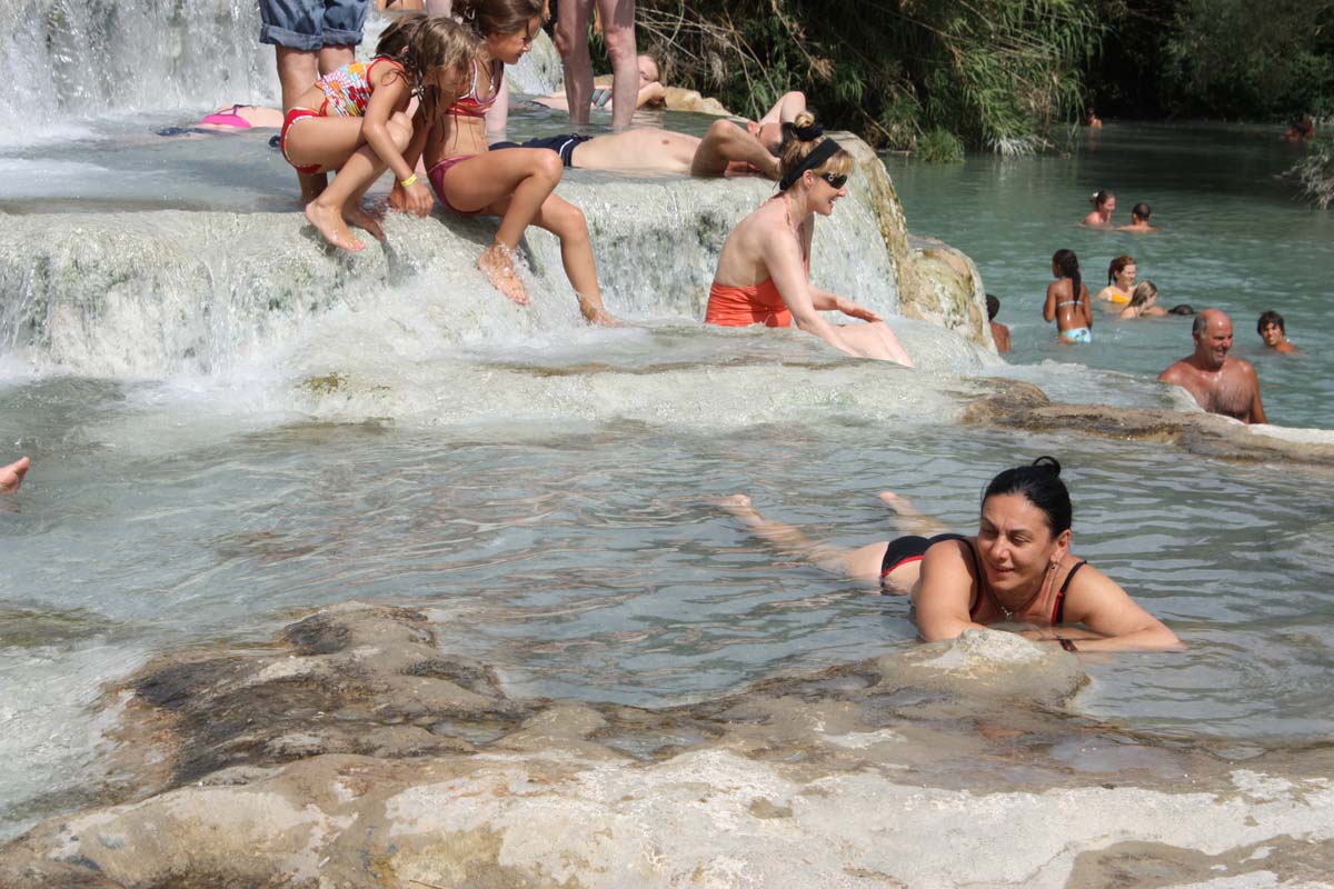 Nakon sat i pol stižemo pred Pitigliano. Vidikovac na rubu ponora nasuprot gradu obavezna je stajanka za sve koji odavde prolaze. Ovaj pogled se nemože opisati riječima. Grad se uzdiže doslovce iz stijena i doima se gotovo nestvarno. Kraj jedne fontane se rashlađujemo, a potom uskom brdskom cestom odlazimo do Sorana. Gotovo je identičan Pitiglianu i doslovno se skliže sa svoje stjenovite hridi. Slijedeće mjesto na našem putu je Sovana. Ovaj skromni zaselak je rodno mjesto Pape Grgura VII iz 11. stoljeća. Na glavnom trgu nalaze se srednjevjekovni Palazzo Pretorio i crkva Santa Maria sa freskama iz 15 st. Po okolnim brdima i dolinama nalaze se mnoge etruščanske grobnice. Kruna našeg izleta ovoga dana svakako je Saturnia. To je mjesto sumpornih izvora čija topla voda i blato bogato mineralima od antičkih vremena pomažu koži i dišnom sustavu. Tu su i istoimene toplice pored kojih prolazimo i zavojitom se cestom spuštamo do Cascata del Gorello nekih dva kilometra južnije. Ovo je zaista fantastično. Iz velike stijene šikljaju dva golema izvora tople vode. Stepenasto se preljevaju preko mnoštva cascada praveći male bazenčiće u kamenu te se slijevaju niz dolinu u toplu riječicu. Ovdje se banjamo sa mnoštvom turista do kasno popodne. Čak nam se pred kraj dana ovdje ukazao nekakav Isus. Sav istetoviran i u nekim krpama s prekriženim rukama izašao je iz Peace Brother kombija sa svojim društvom nalik na apostole i sa dvije peace sestrice. Taj vrlo loš replikant izgledao je kao da će u najmanju ruku održati Govor na Gori. Umjesto toga zapalio je joint i kada je povukao par dimova otišao je kako je i došao.“ Apostoli“ i dvije sestre odoše za njim. U drvenjari pored ovog raja pijemo Italiano esspreso i Coca-colu.