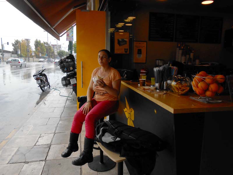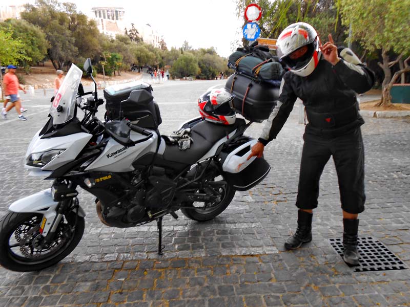 Zaustavljamo se ispod „Svete Stijene“ i hramova koji se smatraju najvažnijim spomenicima zapadnog svijeta, zbog toga što su oni imali najveći utjecaj na zapadnjačku arhitekturu. Većina ovih mramornih remek djela podignuta su tijekom Periklove vladavine u drugoj polovini 5 st. pr. Kr. u tkzv. zlatnom dobu Atene. Većina ih je posvećena Božici i zaštitnici grada Ateni. Tek što smo sišli s motora,uzeli foto opremu u ruke i pogledali štetu na bočnom koferu crni oblaci su se nadvili sa svih strana. Nije trebalo dugo čekati da se iz njih izlije tolika količina vode kakva se rijetko može vidjeti. Kao prekaljenom uživaocu kiše na motoru prvo što mi je palo na pamet bila je misao :“pa ti gdje god da odeš sobom nosiš kišu pa eto i u uvijek sunčanu Grčku“. Diosta nevjerovatno. Lije kao iz kabla. U jurišu pokušavamo spasiti što se spasiti može no već je prekasno jer kiša nas je doslovno potopila. Jedino fotiće i objektive uspjevamo zaštititi a tank torba,jakne i ostala oprema izgledaju kao da su izašli iz perilice rublja bez centrifuge. S ostalim turistima ispod neke strehe čekamo oko sat vremena da se situacija malo smiri.