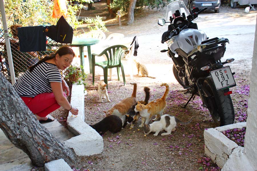 Nakon slasnog obroka odlazimo do Lamie. Kako u Grčkoj kaciga za motocikliste nije obavezna tako i policija koristi tu „privilegiju“. U centru Lamie prilazim jednom policajcu na motoru (naravno ne koristi kacigu) i pitam ga gdje bi mi netko mogao pregledati i eventualno popraviti kabel od navigacije. Na moje čuđenje lik mi odgovara :“nemoj ovdje, idi do Atene jer ovdašnji majstori će ti pričiniti još veću štetu nego što je sada“. Zahvaljujem mu na savjetu i odlazim do terase obližnjeg kafića gdje uz gorku grčku kavu i Marlboro razmišljam o današnjem uzbudljivom danu. Po povratku u kamp sklapamo šator i odlazimo u camp kućicu jer nam je tip sa cjevkom u ruci rekao da je noćenje u kampici skuplje samo 2 eu od mjesta za šator. To je bilo više no dovoljno da željeni počinak zamjenim druženjem s njim na šanku gdje smo se zapili časteći jedan drugoga do sitnih jutarnjih sati. Dok ujutro pakujemo stvari na motor znatiželjno nas promatra veselo mačje društvo.