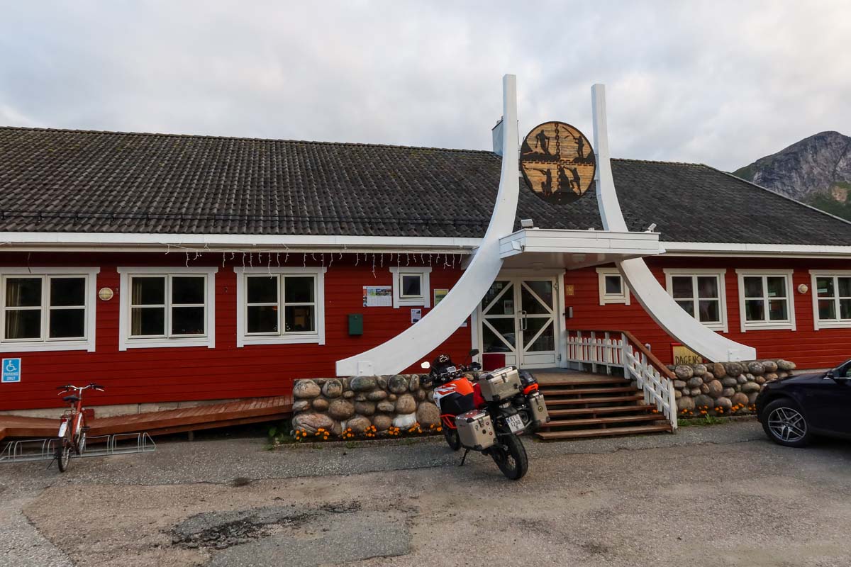 Vožnja ravnicama s pokojim laganim zavojem u bespuću tundre i uz malo prometa stvara osjećaj samoće, posebno u mojem slučaju. Kao da sam sam na svijetu. Dobro, ne baš sam, ipak je moj vjerni pratitelj na kojem jašem tim bespućima sa mnom. Adventure guta kilometre puno lakše nego ja, a znakove umora uopće ne pokazuje i da se njega pita vjerojatno ne bi stajali putem. Ipak, odmor hvatam na jako zanimljivom stajalištu Heia gdje nailazim na Sami shop, najoriginalniji lokal na cijelom putu, odnosno trgovinu punu suvenira ispod velikog vikinškog šatora sa zemljanim podom i vatrom na kojoj se kuha kava. Ispijam kavu i nastavljam prema Langfjordu gdje uz pogled na snijegom pokrivene planine ručam tik do mora.