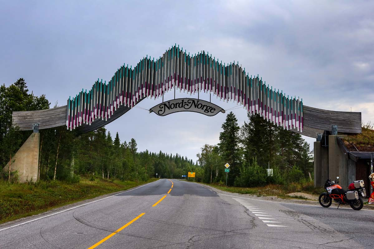 Ubrzo stižem do zanimljivog odmorišta na kojem se preko ceste nadvija veliki znak s natpisom Nord-Norge, odnosno sjeverna Norveška. Kratko odmaram i nastavljam u tempu koji nije kao onaj jučer, ali je ipak dosta življi nego prethodna dva dana. Puno sam opušteniji jer prema to malo prometa koji susrećem ubrzo zaključujem da se ovdje na sjeveru „praši“. Sada tempo držim do 20 km/h iznad ograničenja i nisam u stalnom strahu od kakve kamere ili policije.