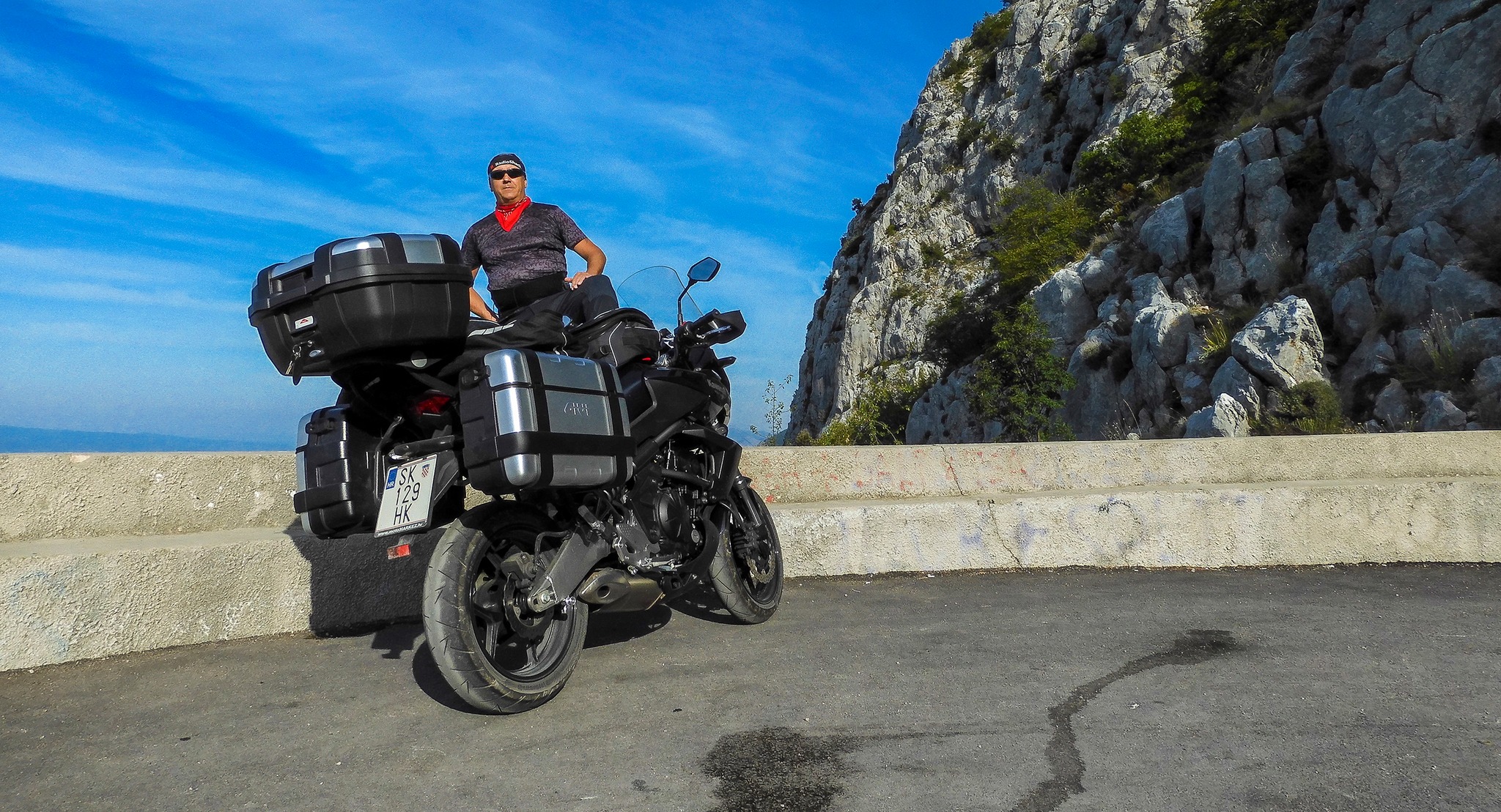 Nakon što sam prošao Vrata Biokova cesta se dodatno suzila i nastavila vijugati između kamenih gromada i vrtača. Na mjestu gdje je bio stari zidani vidikovac sagrađen je novi koji ima stakleni pod nad provalijom od nekoliko stotina metara. Naravno da sam zastao i prošetao po tome čudu neviđenom. Vrlo brzo, nakon planinarskog doma „Pod javorom“ ukazao se kameni odvojak prema još jednom vidikovcu. Nisam štedio motor i prošao sam tim kamenjarom 200-tinjak metar da bi došao do samog ruba litice iznad Makarske. Neprocjenjivo.