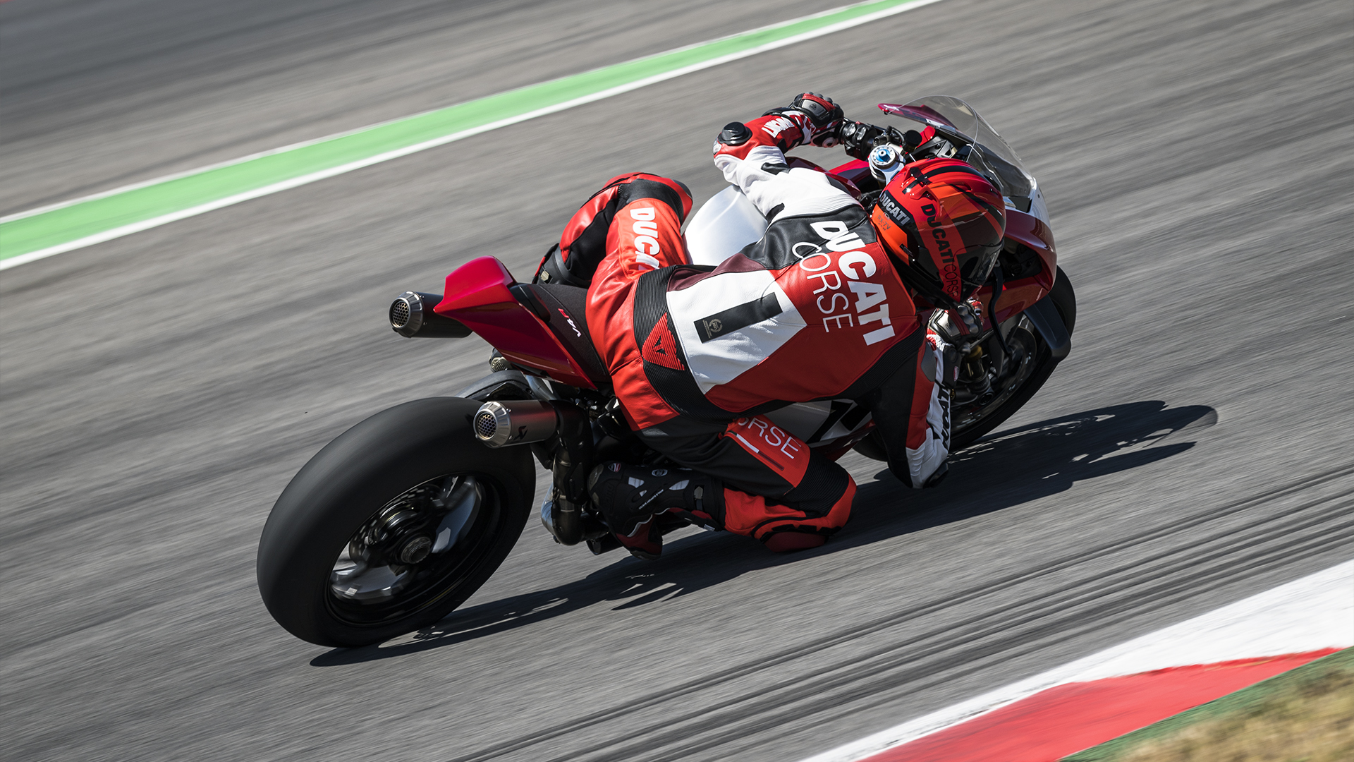 Panigale V4 R s punim trkaćim ispuhom od titana i otvorenim poklopcem spojke od ugljičnih vlakana, nije uključen u standardnu opremu, ali je dostupan kao Ducati Performance dodatak.
