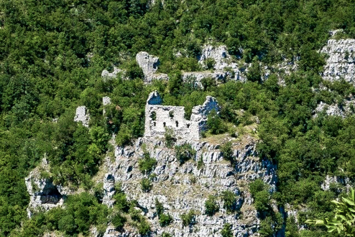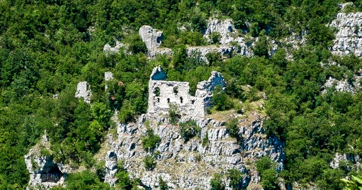 Na vrhu sam brda, put je makadamsko-šljunčani, vodi preko neke livadice i kroz voćnjak te naglo završava. Na kraju sam puta, a nisam stigao do cilja već do male crkvice Svetog Petra i Pavla. Valjda bi odavde trebao nastaviti pješice kroz neprohodnu šikaru i popeti se na susjednu liticu na kojoj leže ostaci drevnog Visuć grada. Ipak je netko bio razuman pa je raskrčio komad grmlja kako bi se i odavde grad vidio.